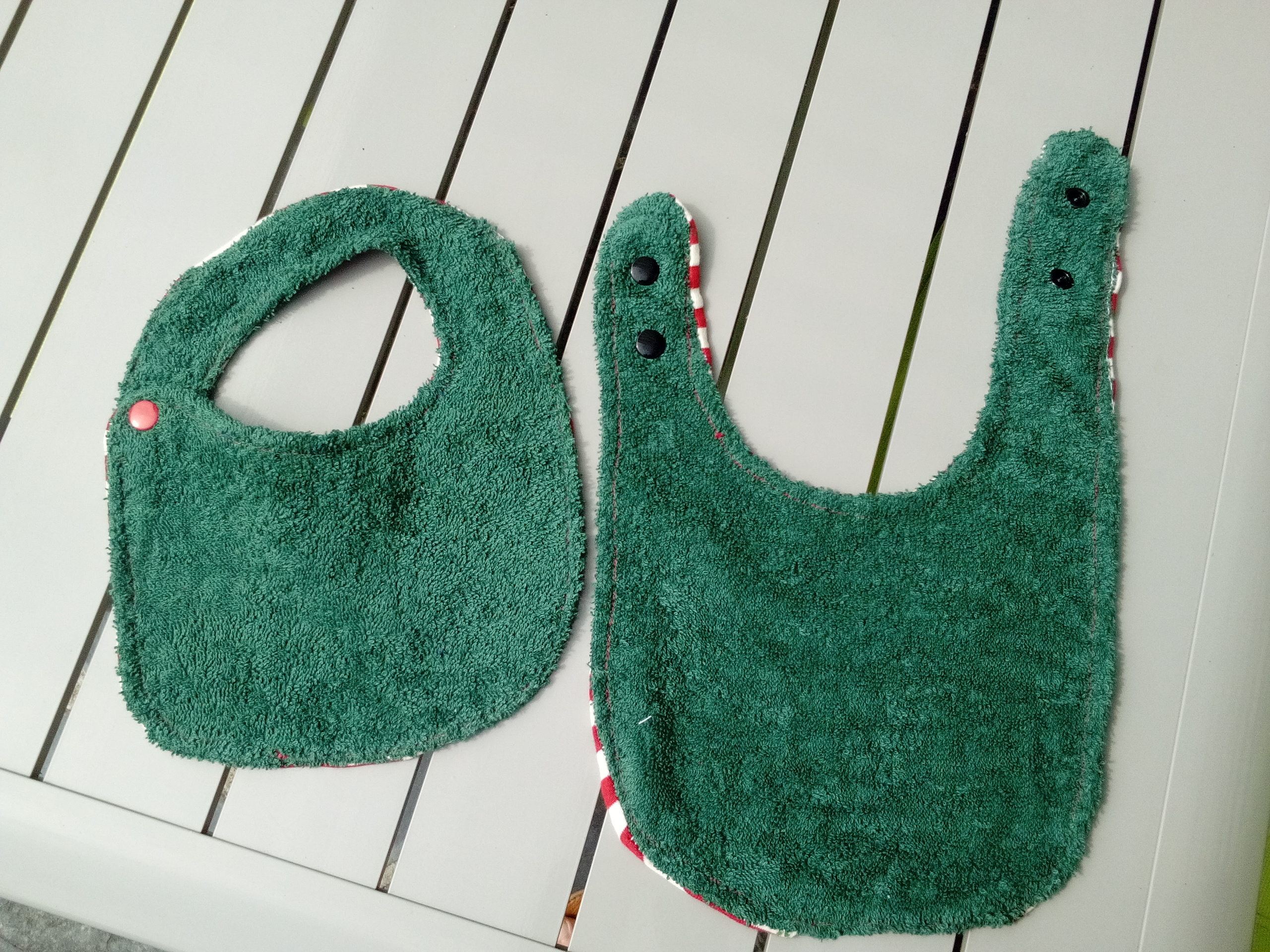 Mes versions mode moussaillon en jersey rayures rouges à fleurettes vertes associé à un tissu éponge vert mousse et une version poisson et tissu éponge bleu. Boutons pressions. Surpiqûre au point droit et zigzag.