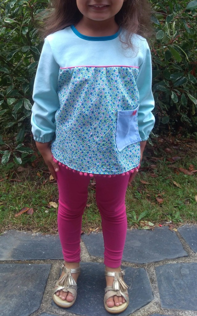 Et voici la dernière cousette pour Mistinguette : une blouse écolière à pompons réalisée à partir du patron modulable de Mélanie Moubarek dont j’ai plus amplement écrit sur les pages précédentes ici et ici. Dernière cousue mais aussi dernière à coudre de ma To Do List pour de longues semaines car Mistinguette n’est pas en reste… Entre les vêtements qu’elle récupère de sa grande sœur (vive le stockage !) et ceux que ma copine me donne, elle a une fille de 6 ans née en mai, Mistinguette a une garde-robe digne d’une princesse… Mais voilà elle aime que je lui fasse des vêtements cousu main, et la jalousie entre sœurs n’étant jamais loin, je me laisse tenter régulièrement !!!