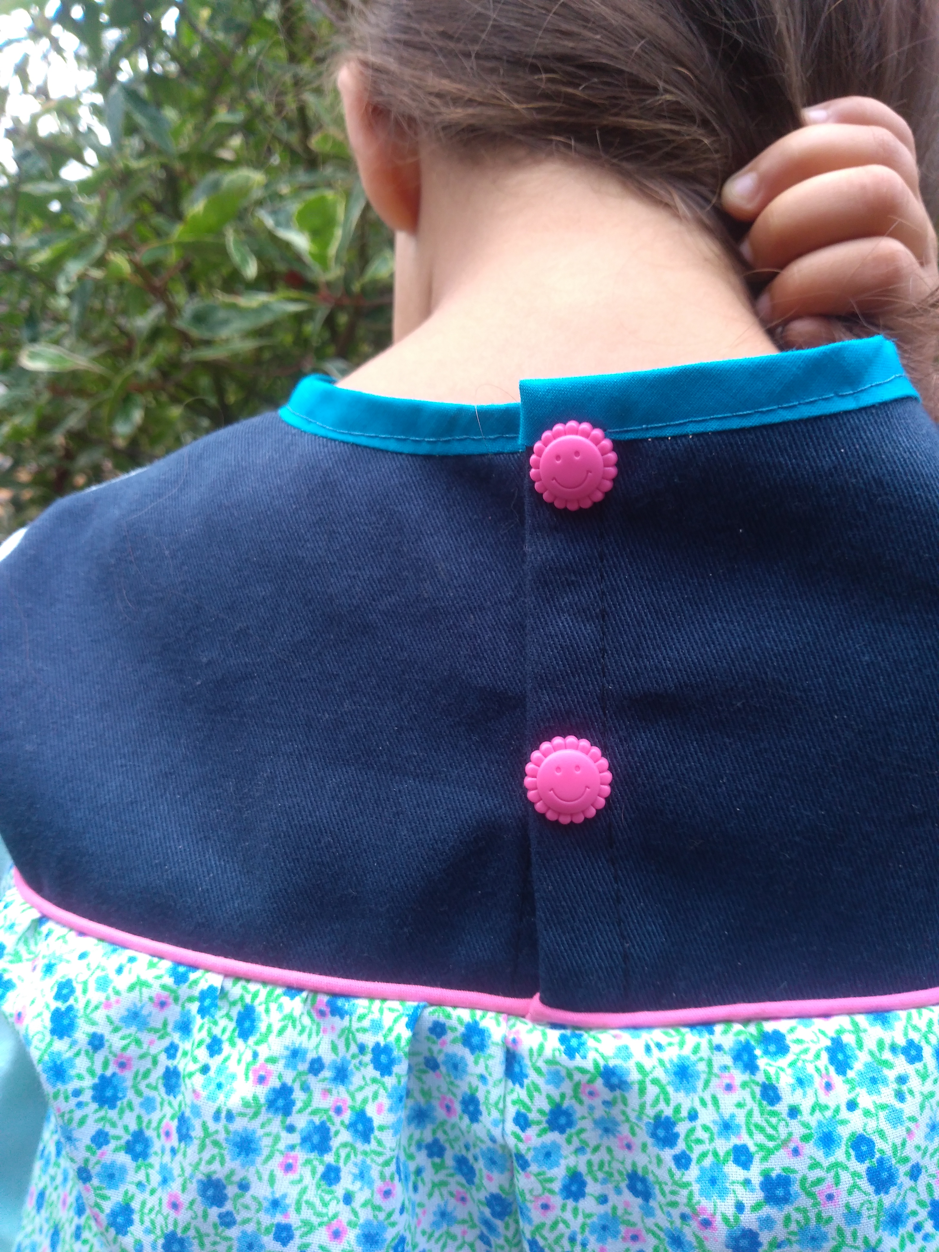 Le tissu vert d’eau est du recyclage (une ancienne blouse en lin ou coton assez épais donnée par ma grand-mère), le liberty est un don de ma tante (son déstockage de grenier ! je l’ai utilisé déjà pour l’intérieur de la trousse double de Mamz’elle l’année dernière), le lin bleu nuit est une chute de la robe (de ma mère) avec laquelle j’avais cousue une robe chasuble brodée de roses pour Mamz’elle en taille 6 – 8 ans (c’était son cadeau pour ses 6 ans, elle va en avoir 9 et elle l’a mets toujours, ça c’est une véritable couture durable !!), les boutons prim love (je ne sais plus le prix) et le passepoil (0,40€ le mètre chez BGF) sont issus de mon stock de même que la ganse de pompons roses vifs (0,90€ le mètre à Bricomarché quand il faisait encore de la mercerie). Donc, cette blouse ne m’a pas coûté non plus les yeux de la tête, je peux encore faire plaisir à Mistinguette sans faire chauffer ma carte-bleue !!! Et en plus ça me déstocke aussi car je croule sous les tissus (j’ai eu un don en nature en contrepartie de ma participation de couturière bénévole à un projet artistique >>> cf ici)