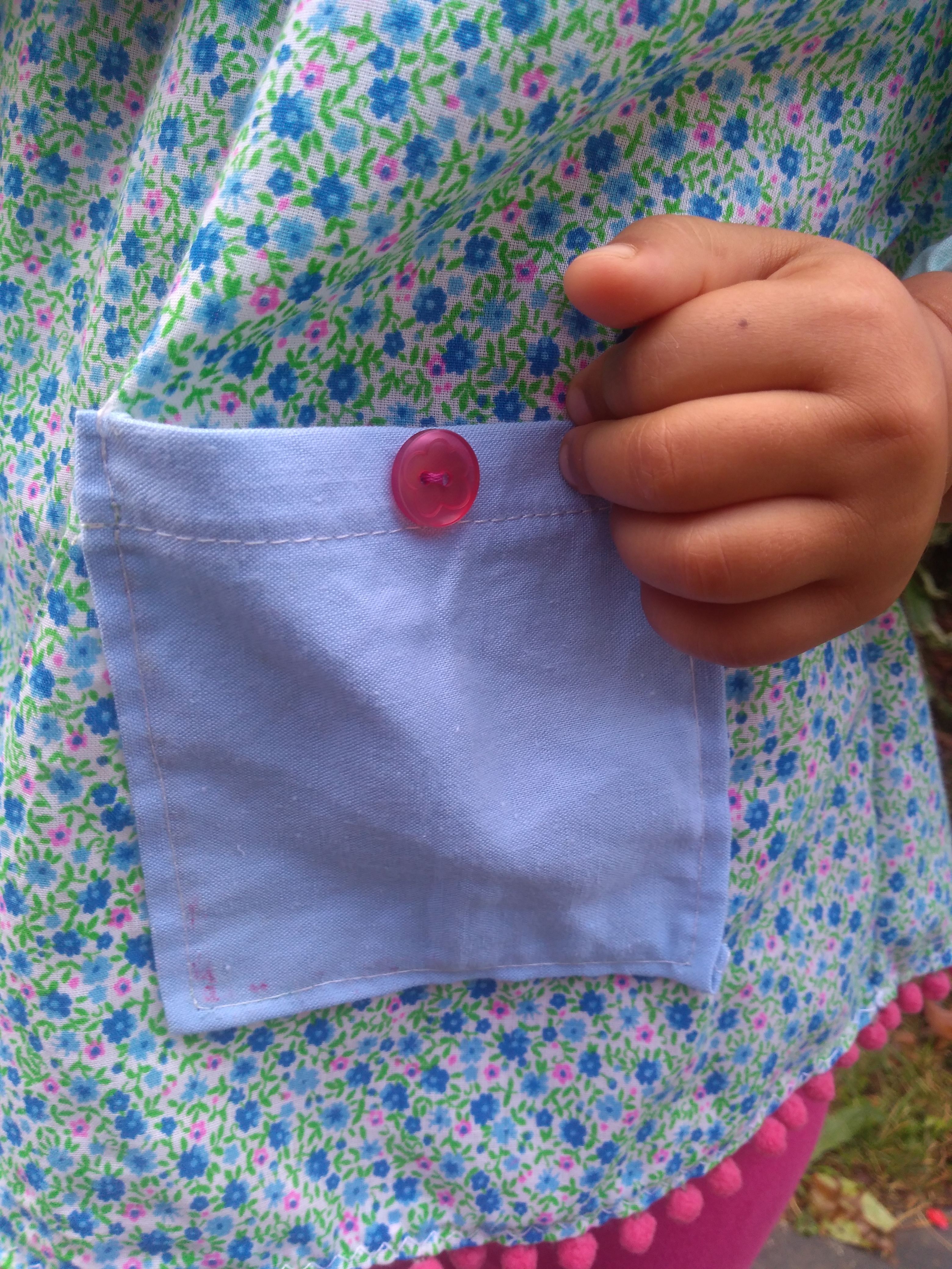 Bon voyons… qu’y-a-t-il de plus que celle cousue en début d’été ? Des manches longues avec un élastique qui resserre (un peu trop d’ailleurs), une poche bleue et des pompons roses.