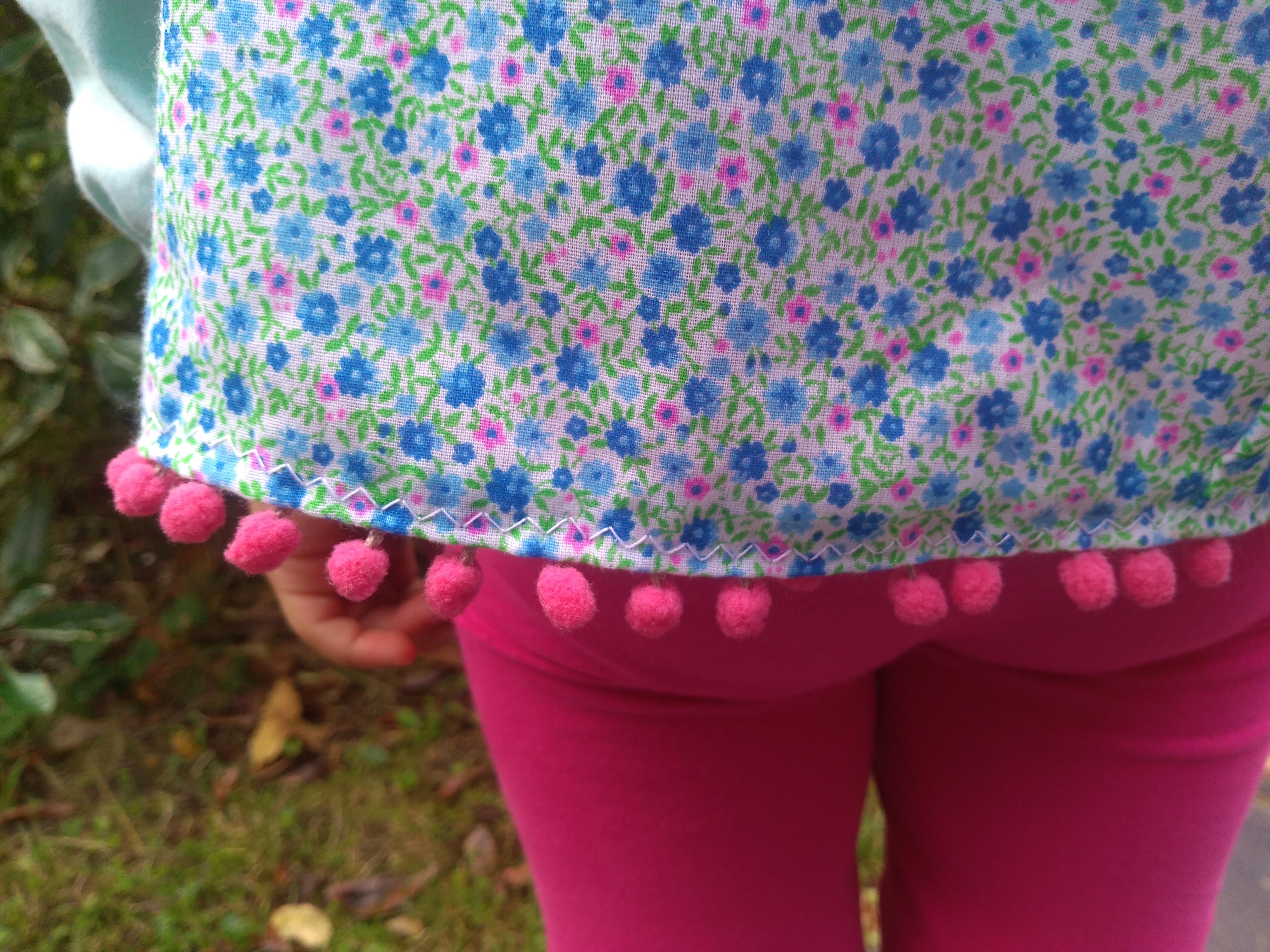 Pour ce qui est de l’assemblage, j’ai cousu le galon à pompons au point zigzag, le reste suit en tout point le pas à pas très illustré du livre Robes et blouses pour petites filles de Mélanie Moubarek.