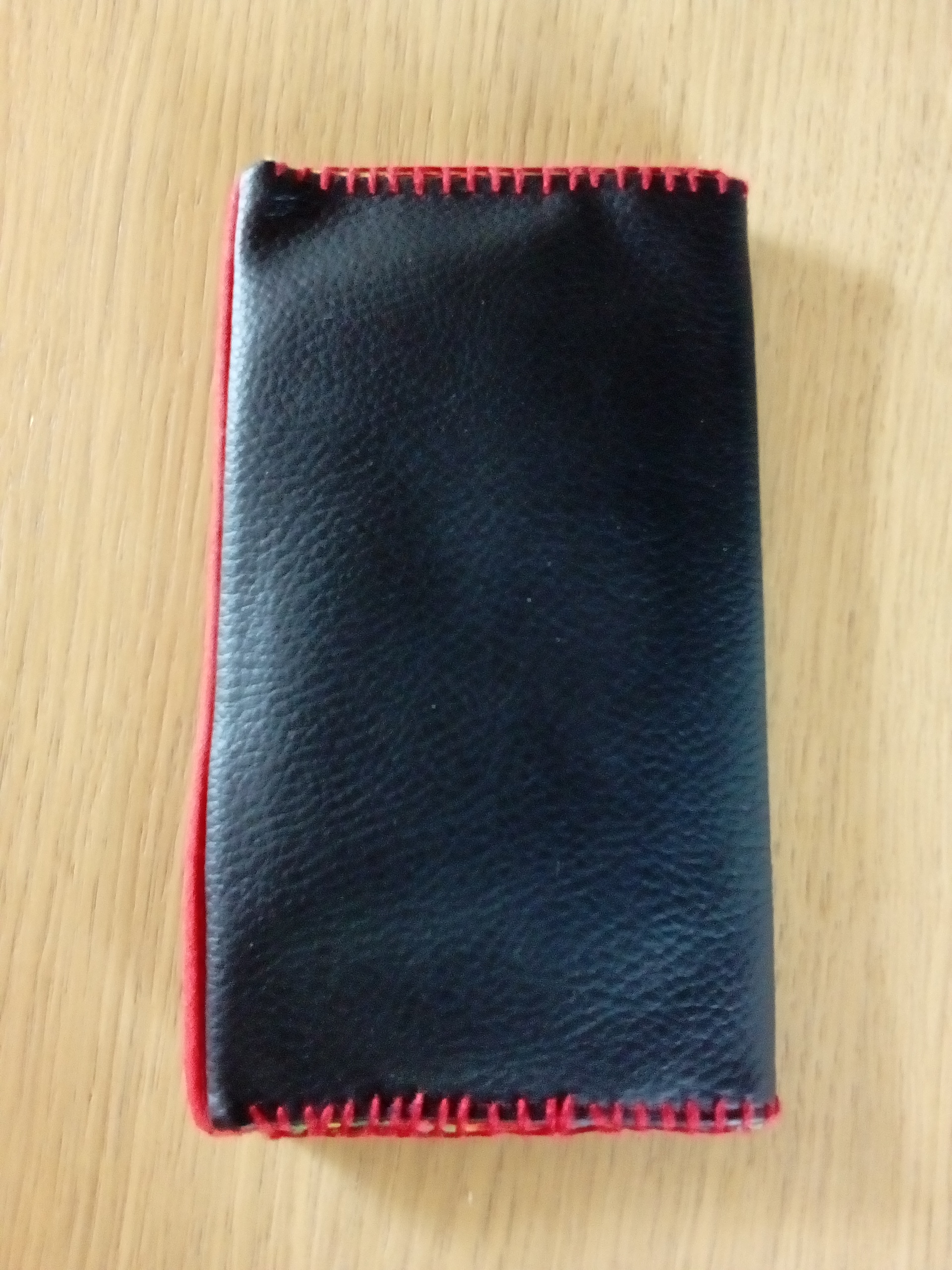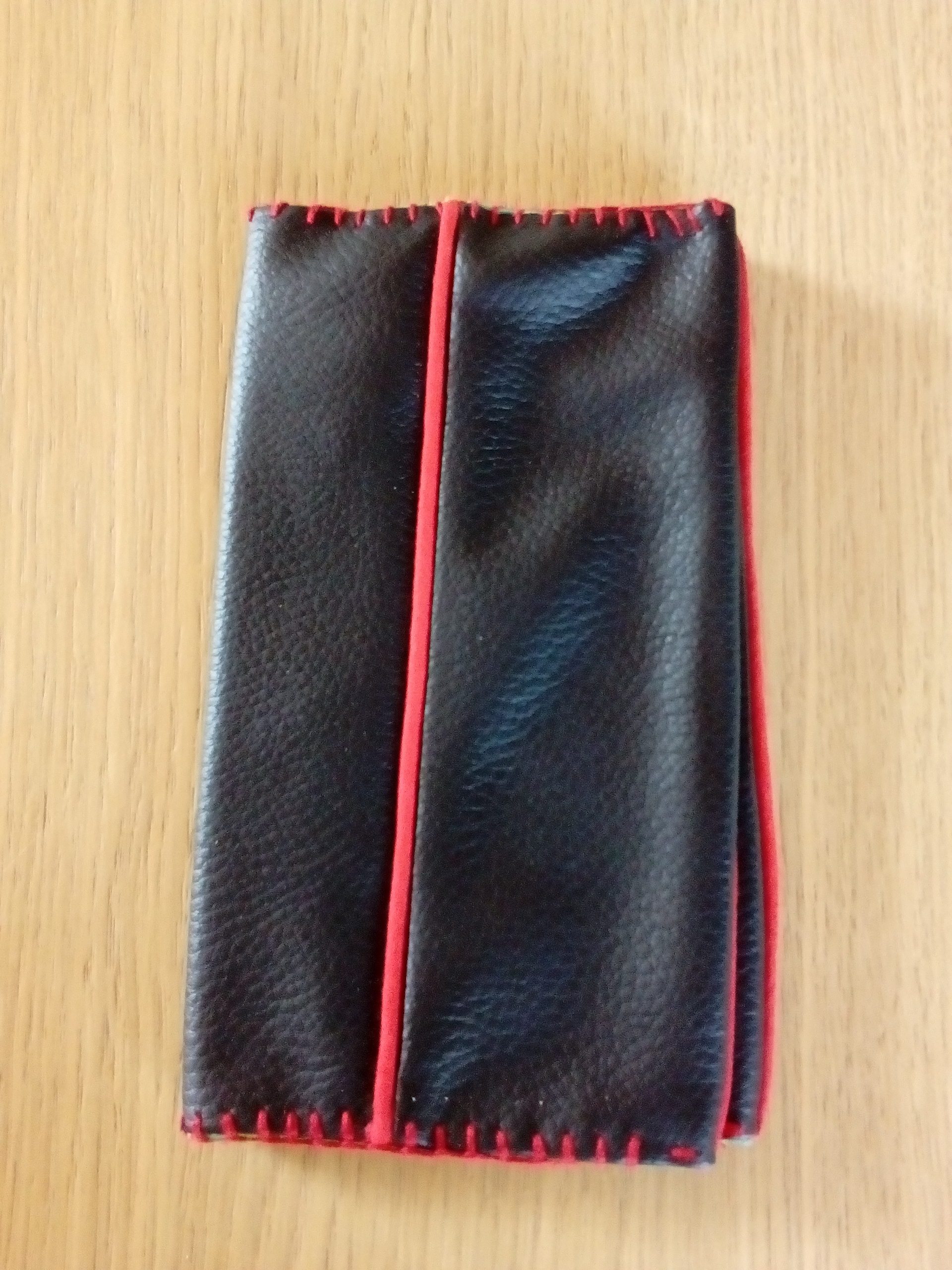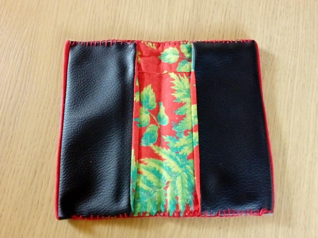 Au moment de la lui coudre, je lui ai demandé en quelle couleur, pas de réponse… Seule la matière était importante à savoir du simili cuir pour qu’elle soit assez rigide pour tenir bien en main et être solide, je précise parce qu’au départ je pensais lui faire en jean recyclé… avec du passepoil double satin blanc et bleu ciel à carreaux ! Donc j’ai hésité assez longtemps entre du bleu pétrole texturé ou du noir, les seuls que j’avais en stock dans cette matière. Le noir a pesé dans la balance car je m’en avais déjà cousu une en bleu à mes débuts de couturière en herbe et la matière était très glissante (vous pouvez la retrouver dans ma page couture ici). J’avais un peu foiré mes finitions à l’époque, du coup, et donc, lorsqu’il a été question de surpiquer l’ensemble pour cette pochette, j’ai préféré le faire à la main avec du fil à broder rouge vif et un point de feston. Les finitions sont propres mais j’ai plus l’impression d’avoir fait une pochette femme qu’homme… Contrairement à ma première version, j’ai mis une doublure en coton dans les tons rouge et vert (le même que pour mon sac à main, c’est peut-être pour cela que j’ai l’impression d’avoir fait une pochette femme d’ailleurs, bien que le motif de feuillage soit unisexe…).