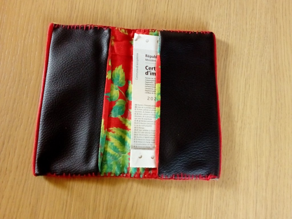 La pochette devait être assez haute pour y mettre les papiers de la voiture avec ses bords à trous, cette demande particulière a été un peu oubliée au passage car lorsque Monsieur a voulu mettre ses papiers, il a dû en plié un côté ! Bon il l’utilise quand même. C’est qu’elle doit lui être vraiment utile et lui plaire un petit peu.
