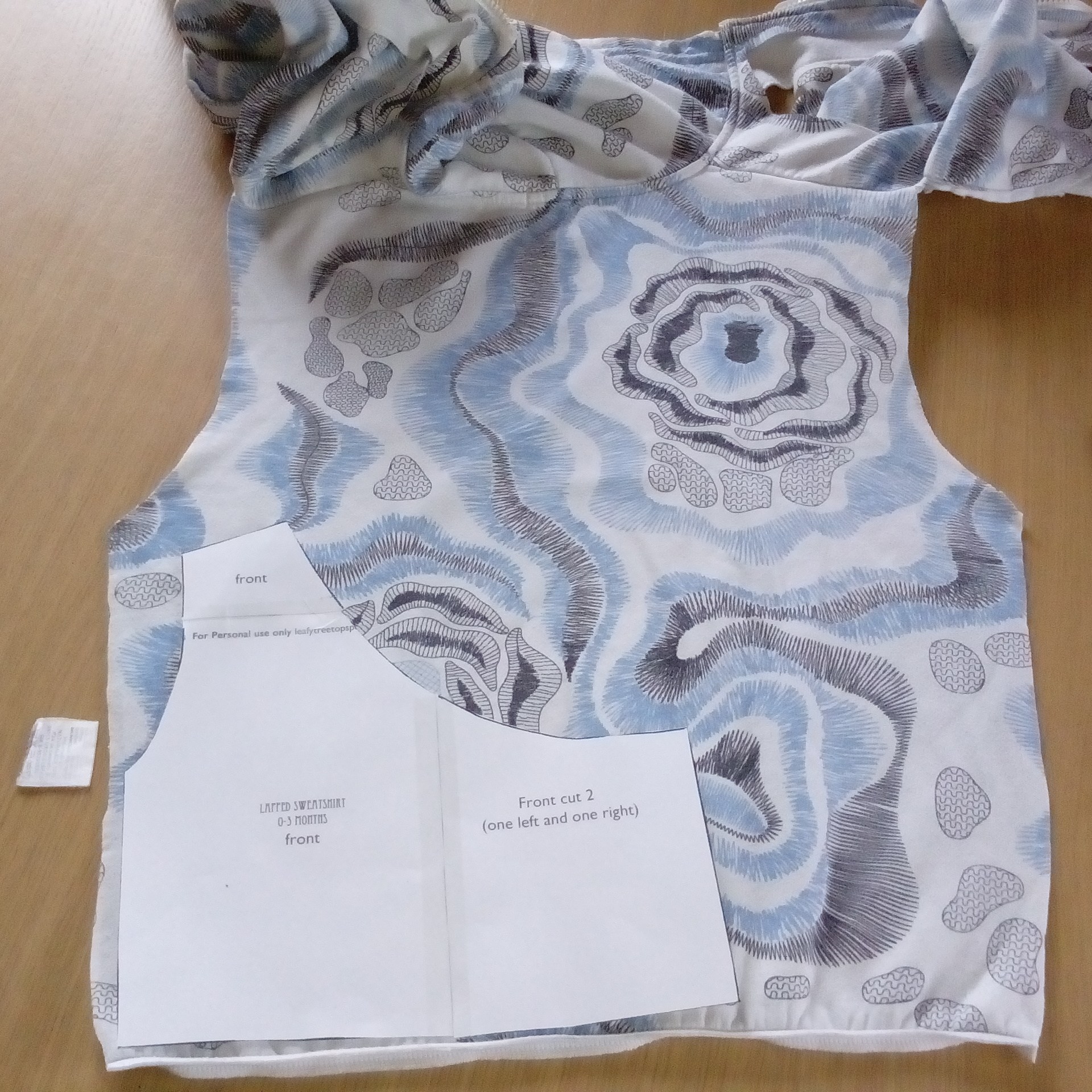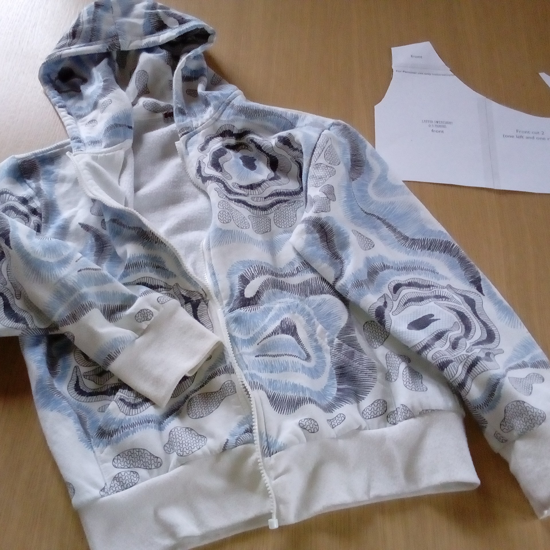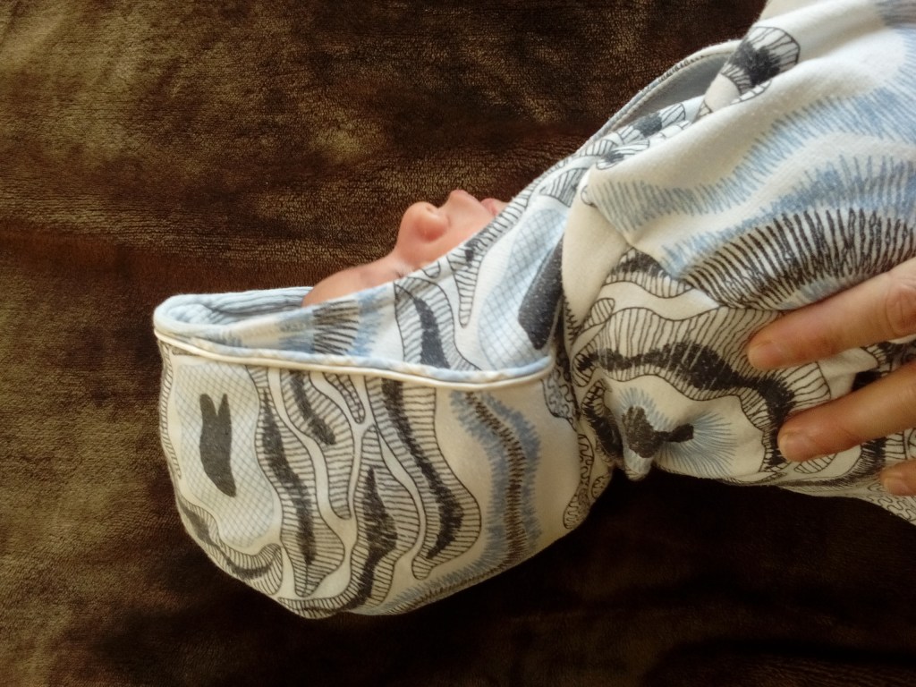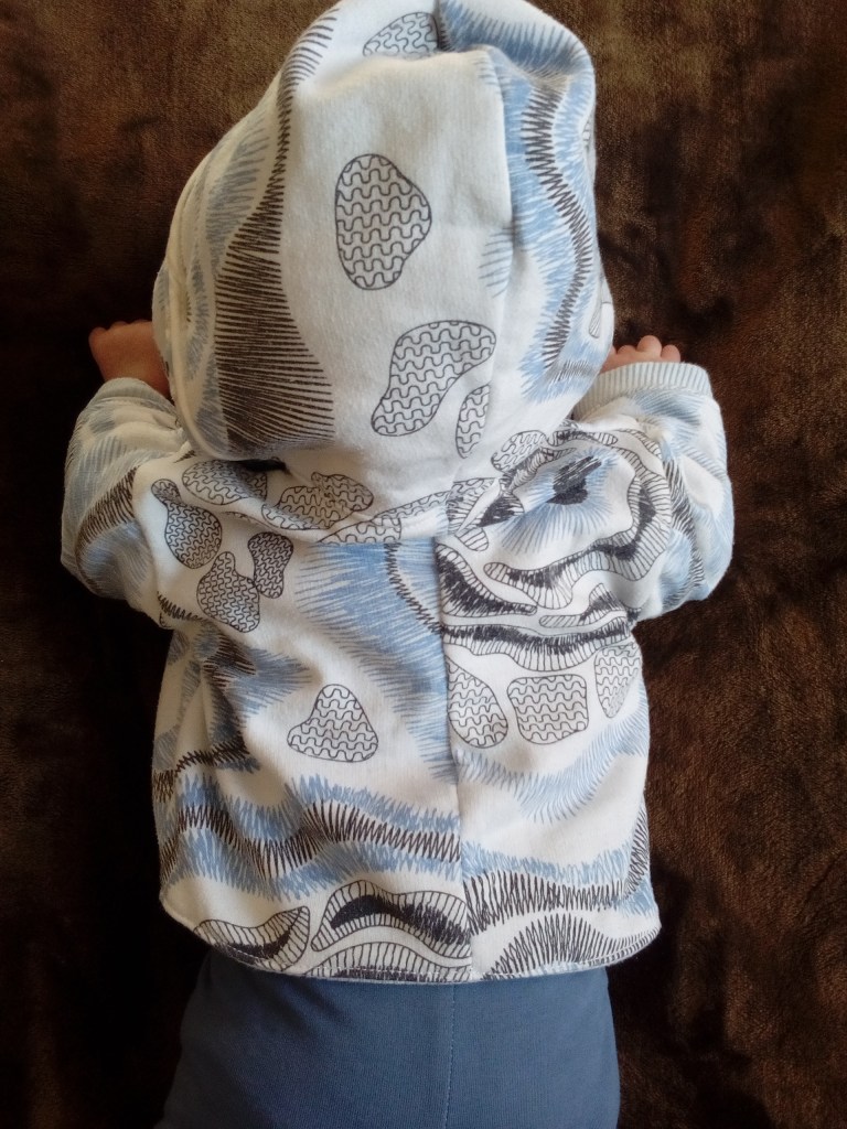 Voilà j’ai eu en septembre la belle surprise de lire sur le blog des Citrouilles à Paillettes qu’elle avait cousu un sweat à capuche pour nourrisson et que le PDF de Leafy treetops est gratuit… alors waouh j’ai foncé télécharger le patron et dès que j’ai eu un peu de temps devant moi j’ai cousu le lapped sweatshirt en 0-3 mois.