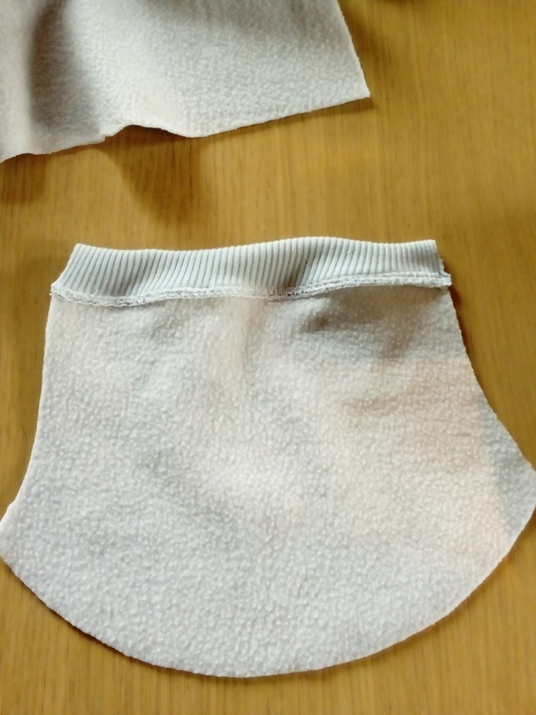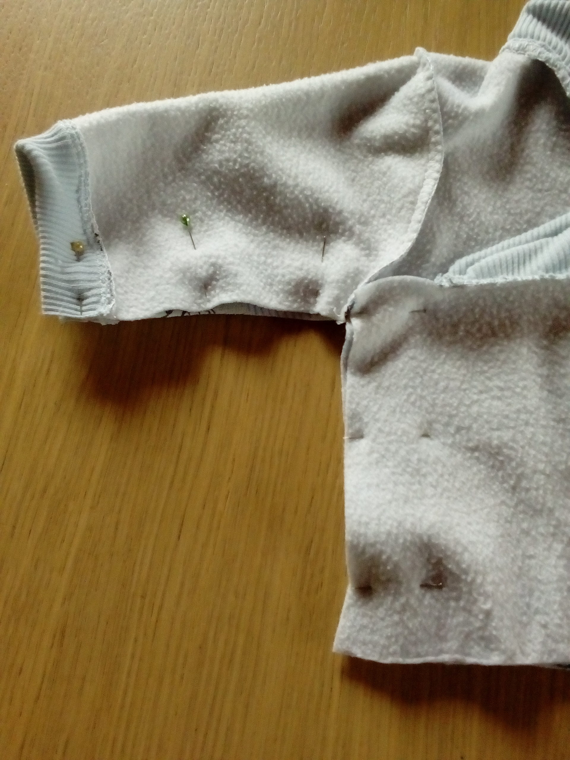 Pour le montage des bracelets de manches et des côtés, qui sont en fait de forme « cache-cœur », ce qui mange un peu plus de tissu faut le dire, j’ai fait à ma manière, ce qui permet de gagner du temps dans la couture et aussi de ne pas se prendre la tête à essayer de faire passer le poignet sous le pied de biche, car en taille trois mois, je ne vous cache pas que c’est petit petit ! Donc je monte d’abord les bord-côtes sur les bas de manche en étirant bien le tissu (ici un vieux tee-shirt pour qu’il resserre bien le poignet).