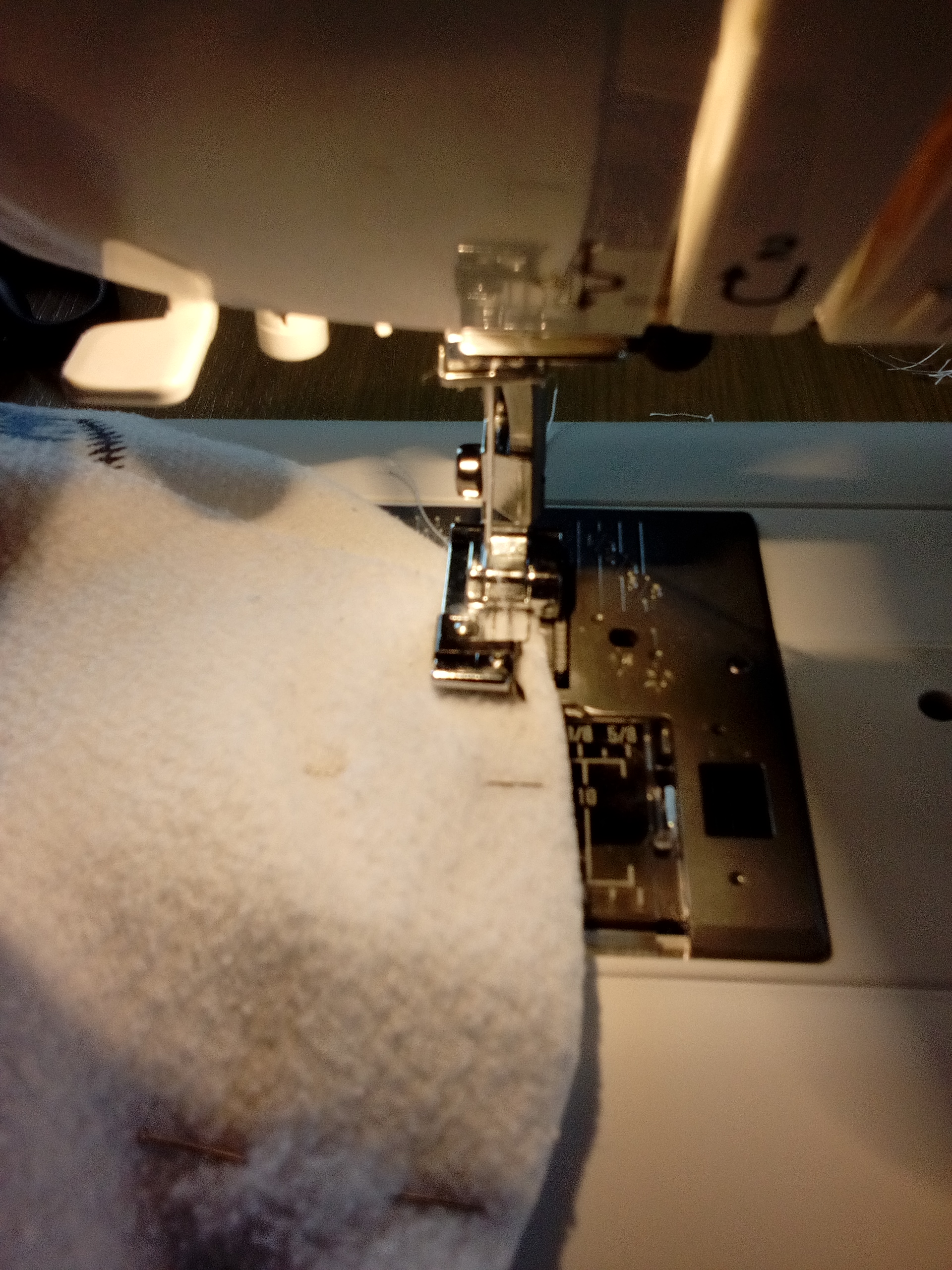 puis je couds les côtés du poignet à l’ourlet du bas ! avec un cache-cœur triple épaisseurs il faut bien faire attention à bien superposer les couches de tissus. Et là j’ai testé le point de surjet de ma nouvelle machine et nickel elle a tout avalé sans brocher la mignonne !!