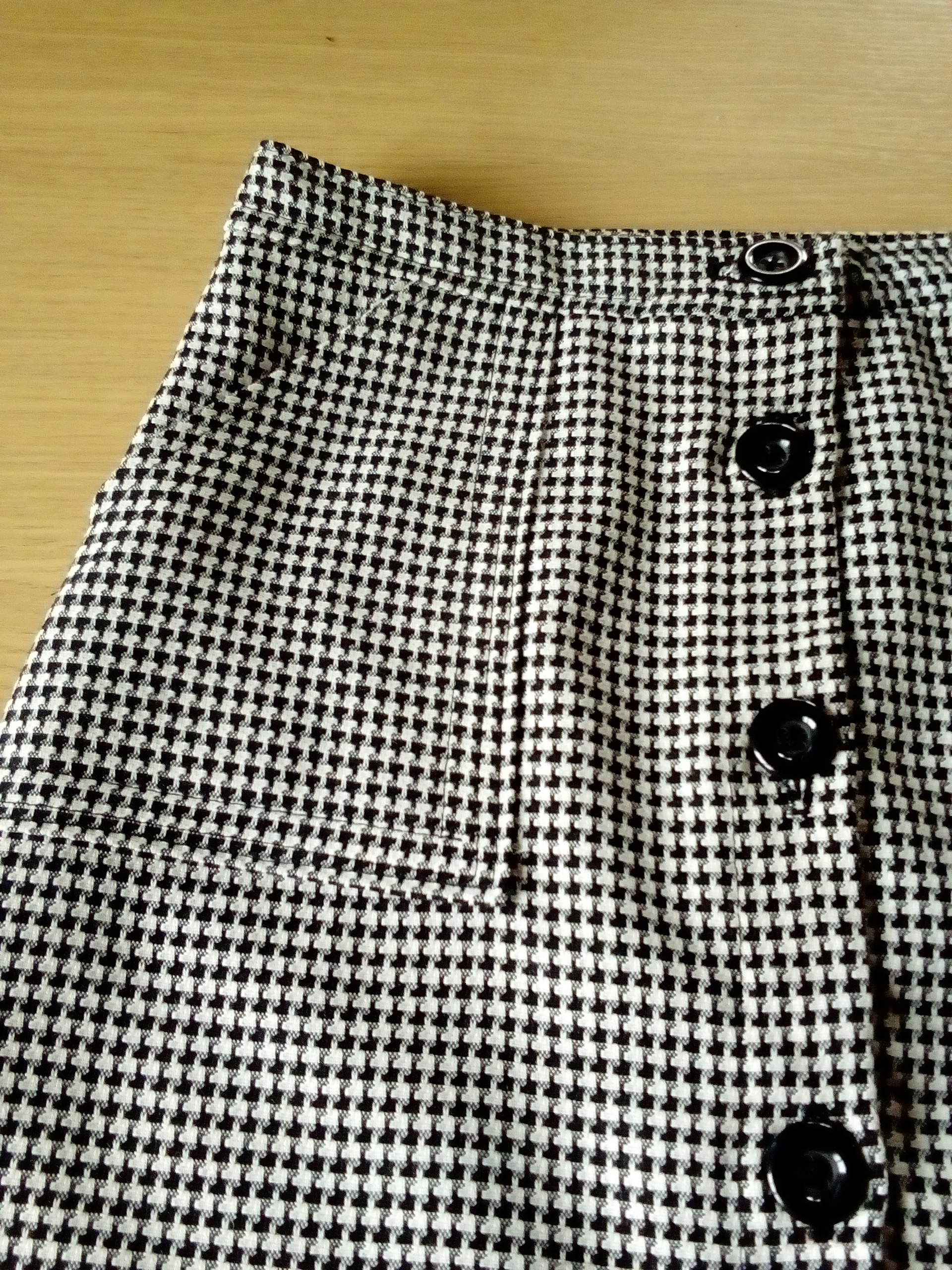 Bon, malgré tout, cette jupe m’a permise de sortir de ma zone de confort et de tester ma nouvelle machine à coudre qui fait des boutonnières automatiques (Houra !). La jupe possède des poches plaquées au dos et des poches plaquées devant prises dans la couture de côté. Je ne connais pas le nom de ce type de poche, j’ai fait des recherches sans succès… Mamz’elle voulait une jupe droite et, dans tous les patrons que j’ai en ma possession, je n’ai trouvé que ce modèle qui est présenté en jean.