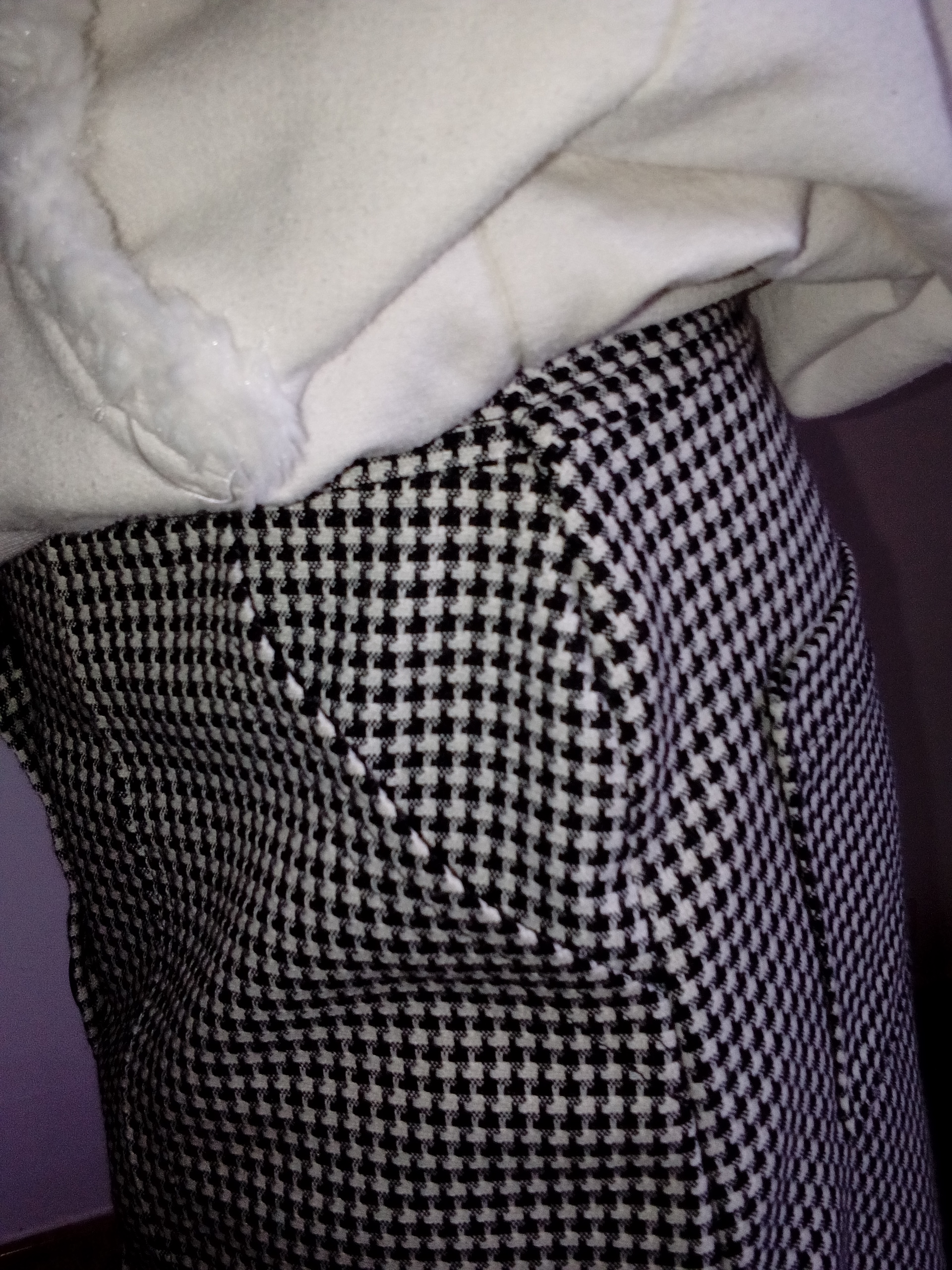 Le + de ce modèle la forme des poches plaquées devant qui permet de jouer avec les couleurs. Je souhaitais au démarrage de cette version la coudre avec des poches noires mais je n’ai pas trouvé dans mon stock un tissu équivalent en épaisseur… Donc je suis restée sur une version soft et chic toute en noir et blanc avec ce magnifique tissu lainage pied de coq. J’aimerais vraiment en faire une deuxième version d’été avec les poches contrastées.