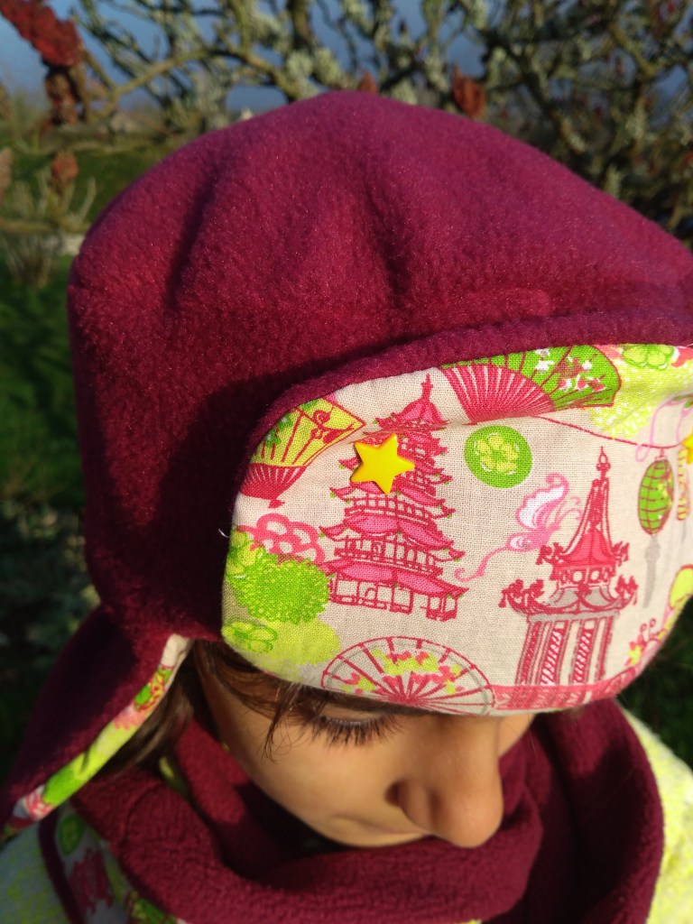 Donc pour en revenir à cette chapka elle est composée de polaire cerise qui est assortie à son snood cousu l’année dernière, pour parfaire la panoplie et si j’ai le temps et si j’ai assez de tissu des mitaines sont prévues. J’ai posé deux pressions étoiles pour fixer la visière, c’est plus pour le côté décoratif, le patron préconisait de la fixer avec des points de couture mais je ne trouvais pas cela assez funky. Ce qui est sympa avec ce modèle c’est que, si l’on retire la visière et les protège-oreilles, on obtient une toque et donc un deuxième modèle de couvre-chef. On peut l’imaginer avec d’autres matières et d’autres couleurs, ici, j’ai choisi d’optimiser mes chutes de polaires mais on peut aisément imaginer de faire la bande de tour de tête dans une autre couleur ou bien les protège-oreilles…