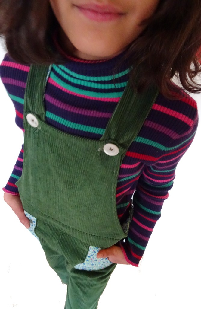Hum Hum bon bon bon reprenons-nous : Alors voilà pour remédier à la garde-robe de mon aînée qui se désemplissait à la vitesse de la lumière, en décembre dernier je lui ai proposé de feuilleter le magazine d’Ottobre Design et de choisir un modèle qui lui faisait envie (et qui était à ma portée niveau compétence et choix de tissu). Elle a en choisi plusieurs mais mon temps est réduit à peau de chagrin avec bébé et j’ai décidé de faire uniquement le pantalon salopette (les autres modèles attendront l’année prochaine).