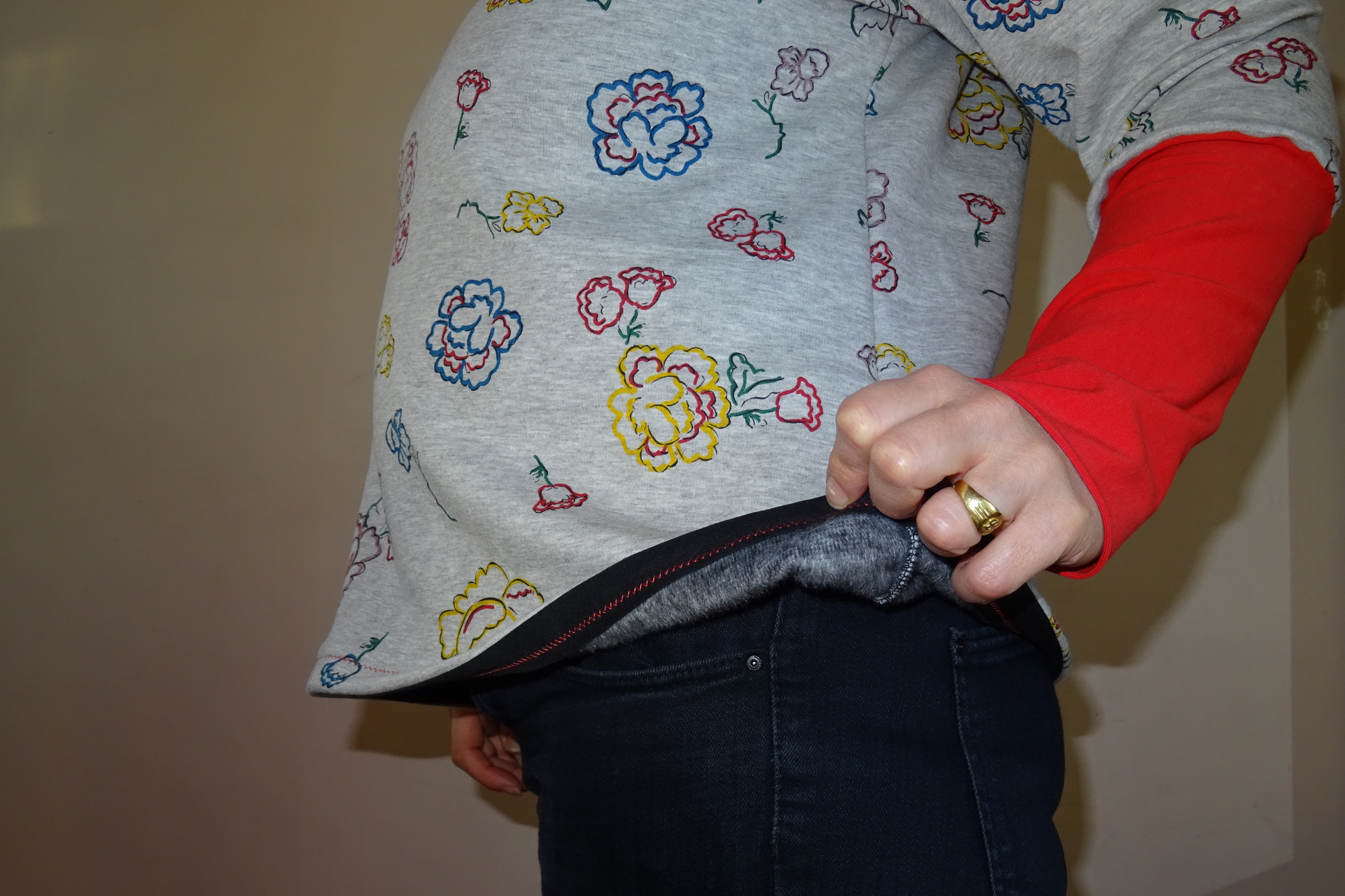 Au début, je voulais le mixer avec du sweat bleu électrique ou bleu roi, mais je n’en ai pas trouvé (enfin dans les magasins) ensuite je me suis dit bon je vais le refaire en noir sauf que je n’en avais pas assez et que sur le site internet où j’achète quelque fois du tissus (pas bien là mauvais choix écologique), et bien, en décembre dernier, il n’y en avais plus pour cause de rupture de stock (il semblerait que je sois la seule à avoir une conscience écologique poussée à ce point – ironie)… Et ensuite je me suis souvenue de ce jersey rouge qui ne l’est pas puisqu’il est brique enfin c’est ce que la vendeuse m’a dit lorsque je cherchais du jersey uni, je me suis laissée tenter grâce à la lumière électrique qui a légèrement modifiée son impression colorimétrique… Elle m’a (r)assurée qu’il n’était pas rouge mais brique… mouais ! Avec le tissu jersey moutarde ça passe mais avec ce tissu sweat il fait vraiment rouge. De plus, j’ai eu la super bonne idée de le mettre en doublure du col snood et moi qui ne porte jamais cette couleur, là, c’est vraiment trop.