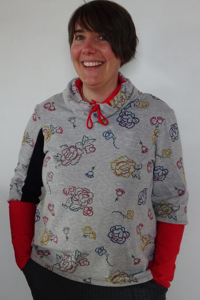 J’ai ajouté une partie noire (ah non il ne faut pas dire ce mot c’est un gros mot, il faut dire de couleur… ça c’est un de mes élèves de quatrième l’année dernière – enfin en octobre 2019 – qui m’a reprise pendant un de mes cours d’arts plastiques. Ce jour-là j’ai bien cru qu’il allait appeler SOS Racisme, du coup s’en est suivi une longue conversation entre lui et moi pendant le non-cours sur ce qu’est le racisme, les couleurs et leur appellation). Bon, là, je suis encore une fois en train de vous raconter ma vie. Sur ce, je reviens à ma manche : donc sur une seule manche j’ai mis un tissu d’une autre couleur plus foncée parce que je n’en avais pas assez pour faire les deux manches et pas assez de tissu polaire à fleurs pour coudre la manche qui me restait dans ce tissu non plus, bon vous me suivez toujours là ou il faut que je répète ?