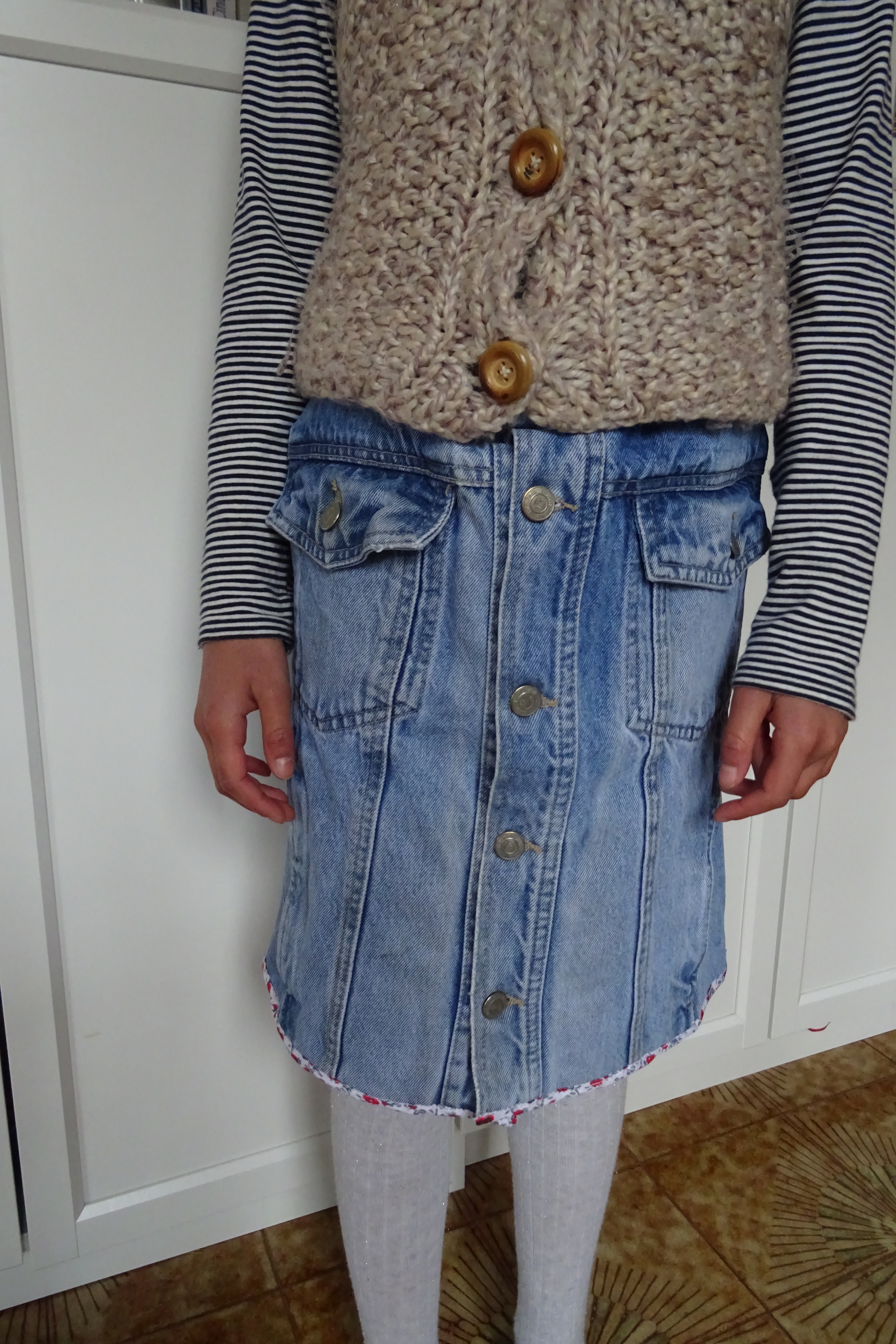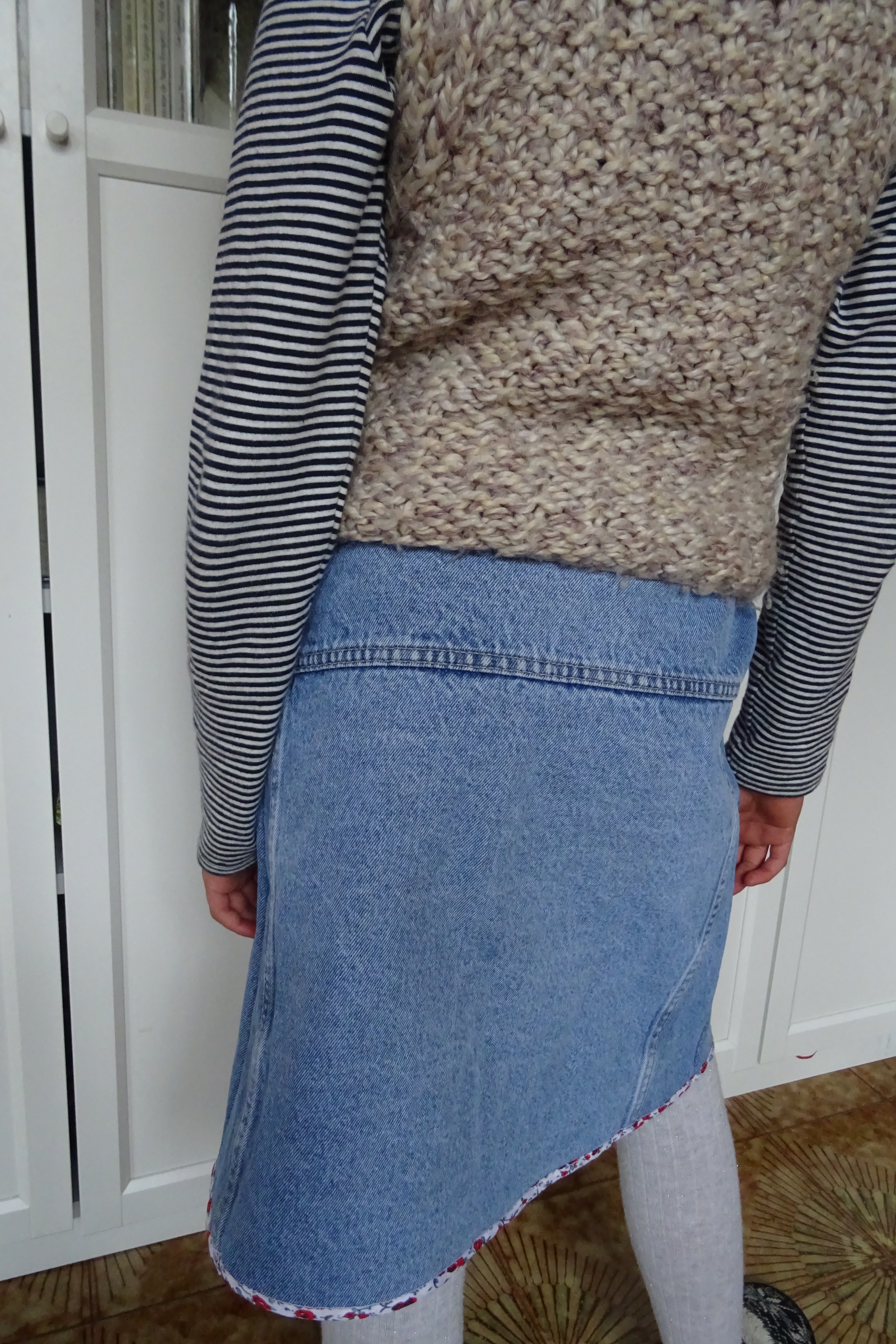J’ai bien failli « retourner ma veste » au moment de l’assemblage car ma machine, bien que sophistiquée, a eu dû mal à coudre correctement certains endroits, là, où les tissus avaient des coutures épaisses… Mais bon me « prendre une veste » encore une fois ça n’est pas bon pour le moral alors j’ai persévéré et terminé cette petite jupette. Et Mamz’elle était trop contente d’avoir sa jupe en jean cousue par Super Mam’ ! Ouais moi aussi je suis une héroïne (non pas la drogue dure… la super Héros fille car on dit un héros une héroïne !) D’abord c’est mon docteur qu’il l’a dit que j’étais une héroïne des temps modernes alors hum !😋 S’il le dit c’est que c’est vrai non ? (Franchement je ne sais plus pourquoi il m’a dit ça je crois que c’est rapport à P’tit Coeur qui se réveille toujours la nuit…)