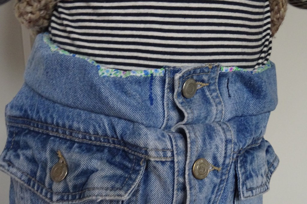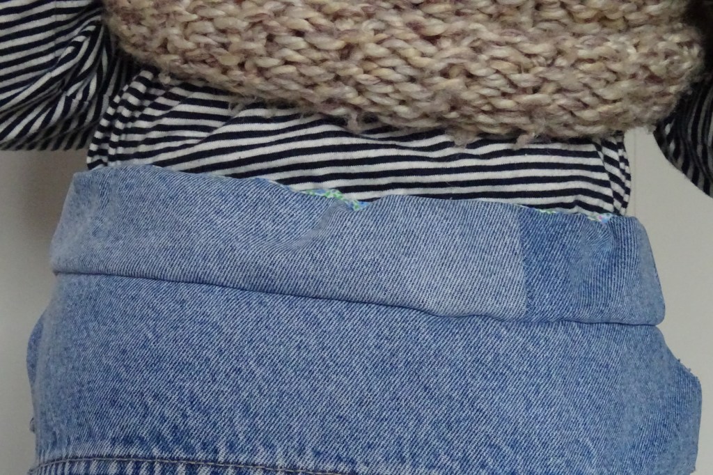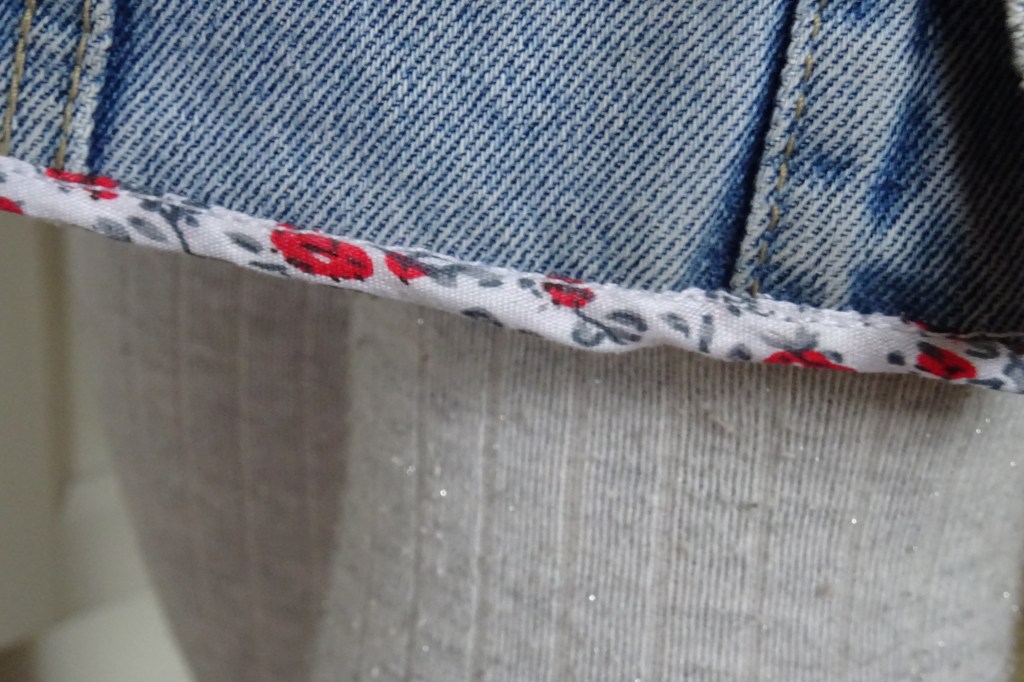 Le biais en bas pour terminer ce vêtement proprement est différent de la doublure car j’avais fait mon propre biais qui s’est trouvé être trop étroit et qui n’allait pas à coudre, le jean étant vraiment trop épais…