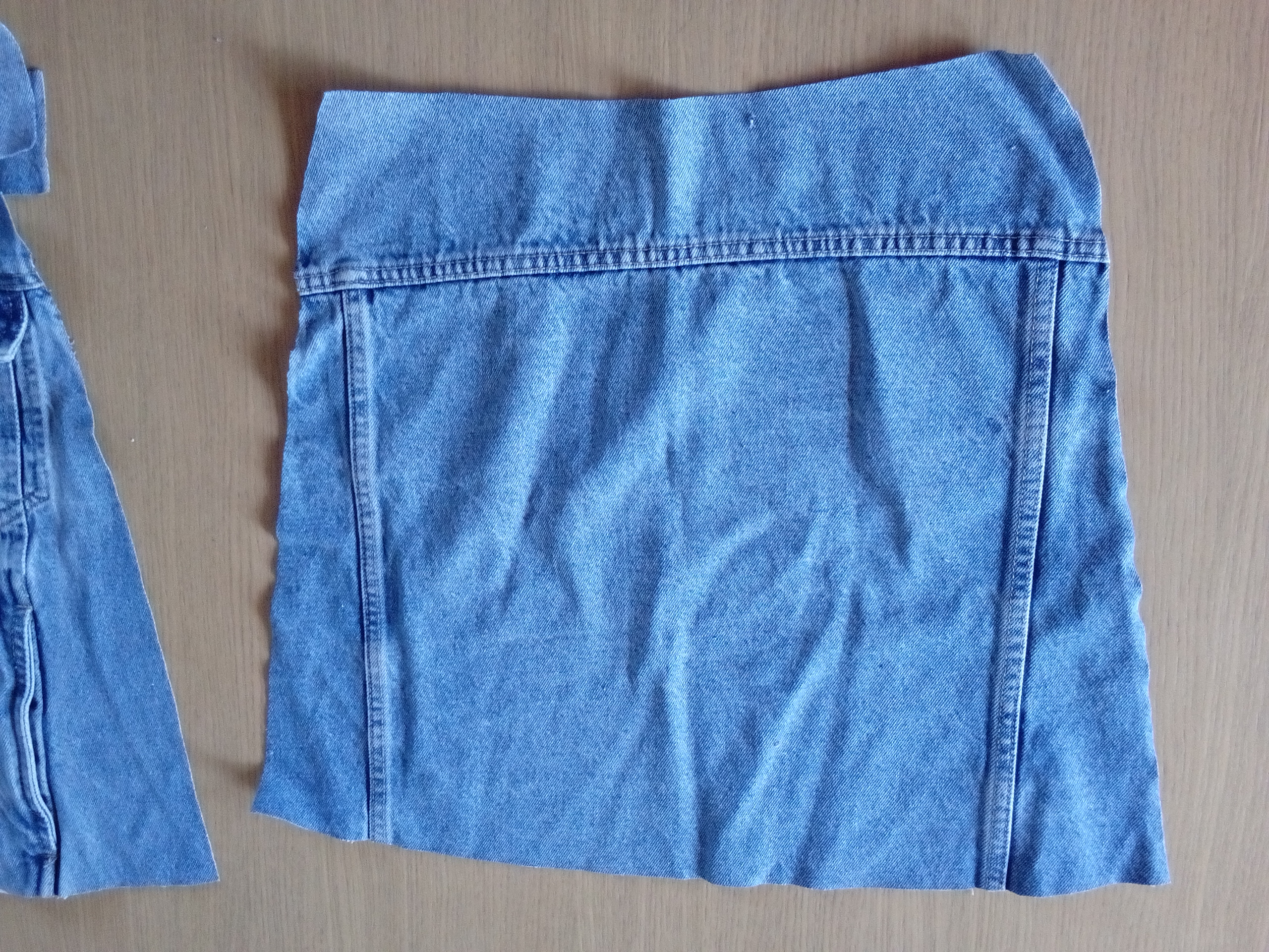 J’ai coupé une ceinture et sa doublure à laquelle j’ai dû rajouter des bouts car elle ne s’adaptait pas au bas de la jupe (côté dos parce que si vous regardez la photo vous vous dites « elle a fumé la moquette ou quoi ? » )