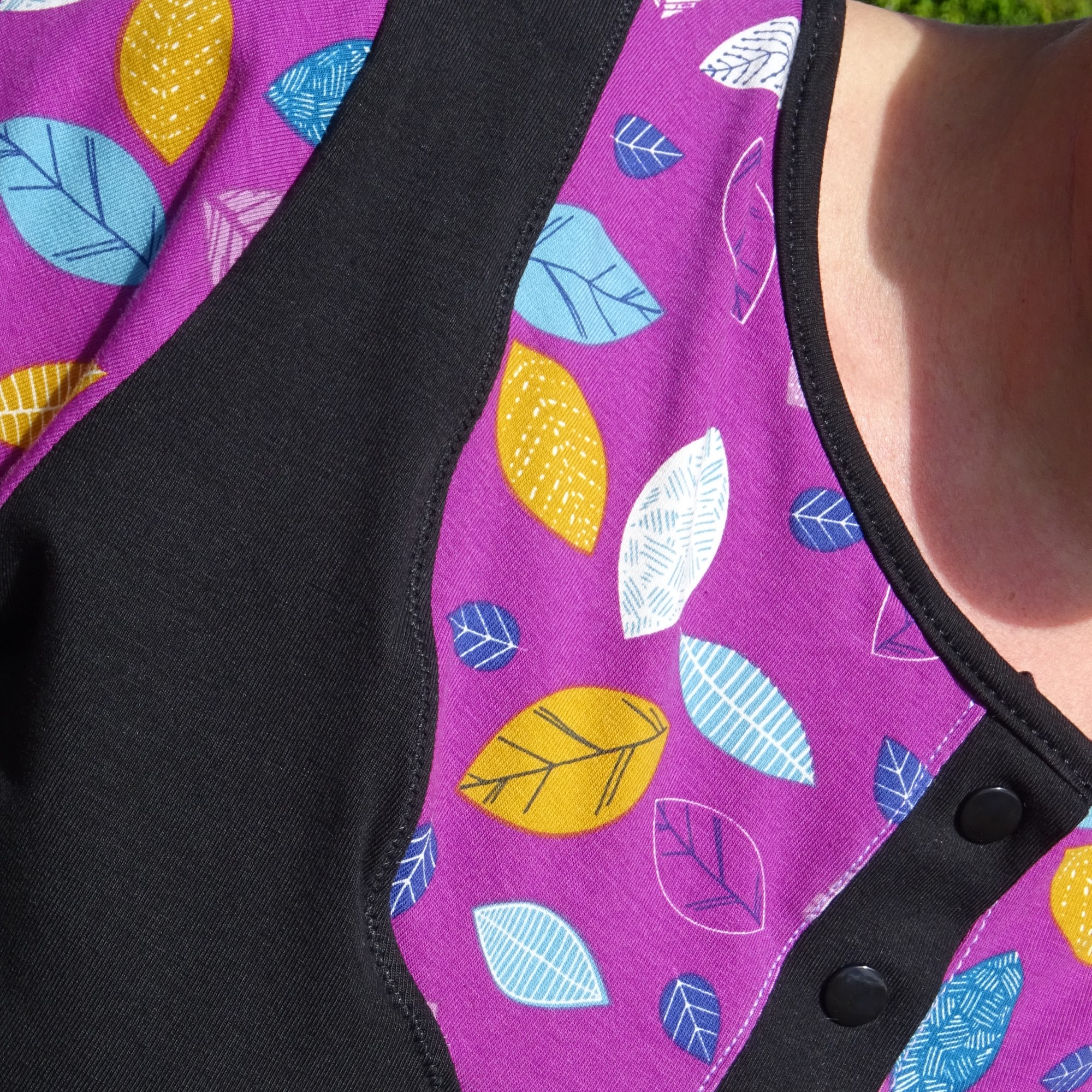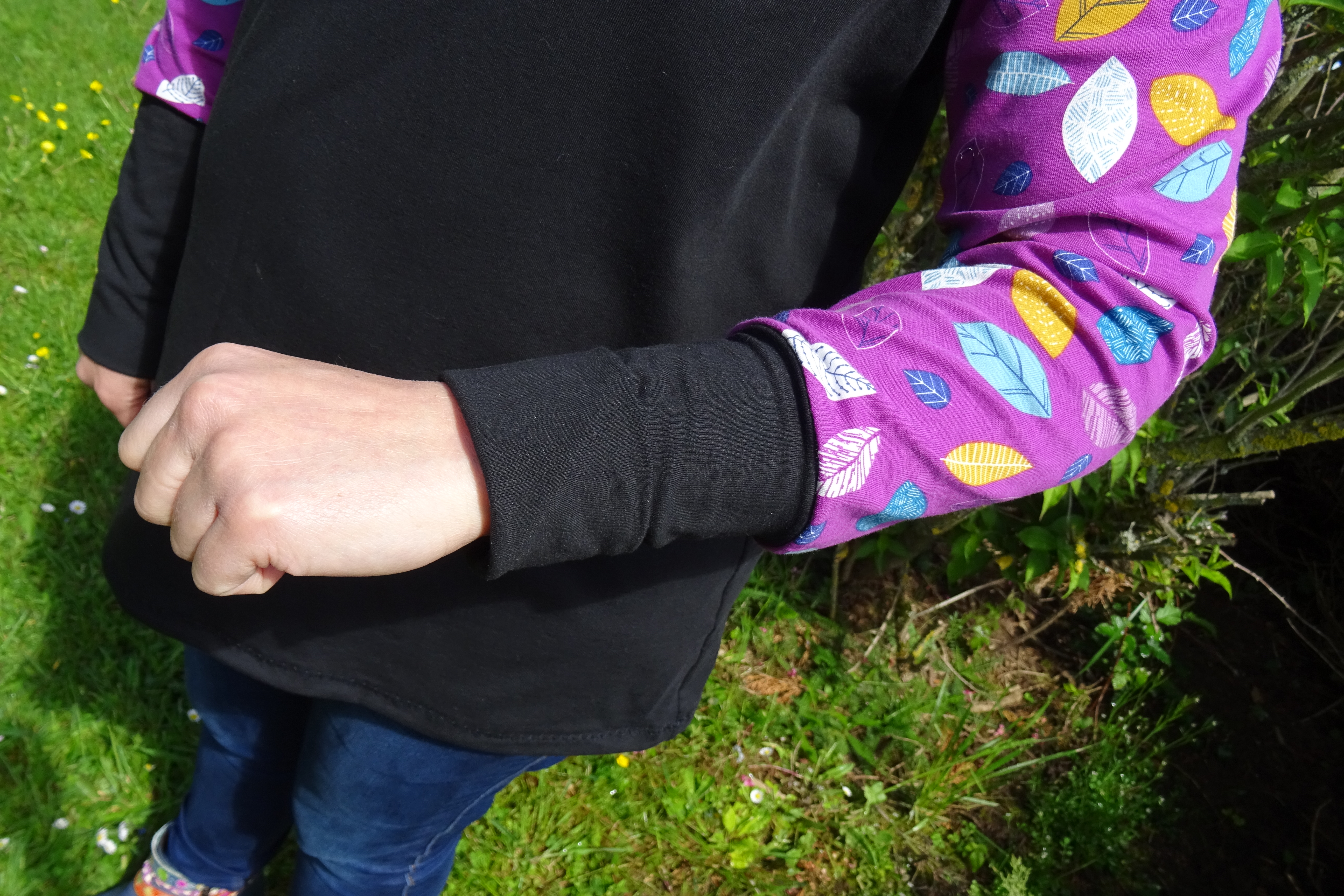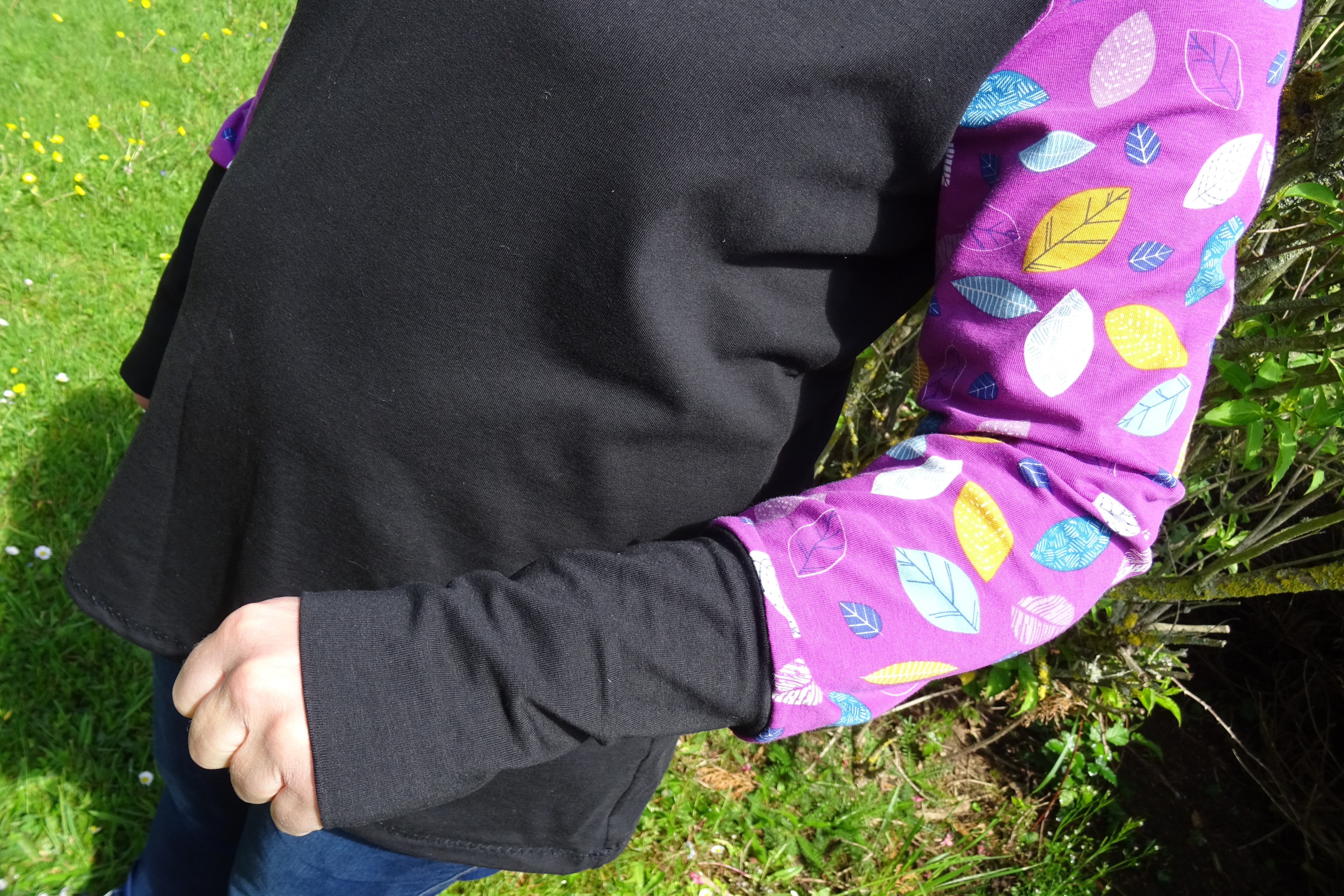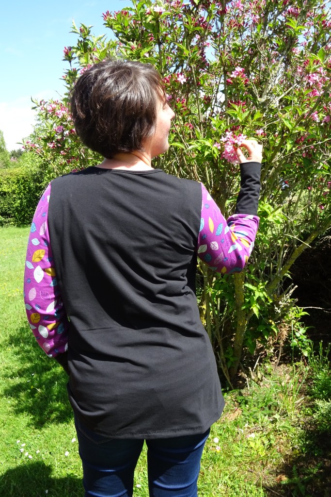 Ma version est celle à manches longues droites auxquelles j’ai ajouté des bracelets de manche. J’ai pris le parti de mettre les manches dans le tissu à motifs pour ne rien gâcher de ce merveilleux tissu que j’avais acheté chez Marine Du Point ZigZag. J’aime beaucoup le rendu qui fait comme si j’avais deux tee-shirts superposés, euh… j’avoue que ce n’était pas vraiment anticipé ! mais ça le fait.