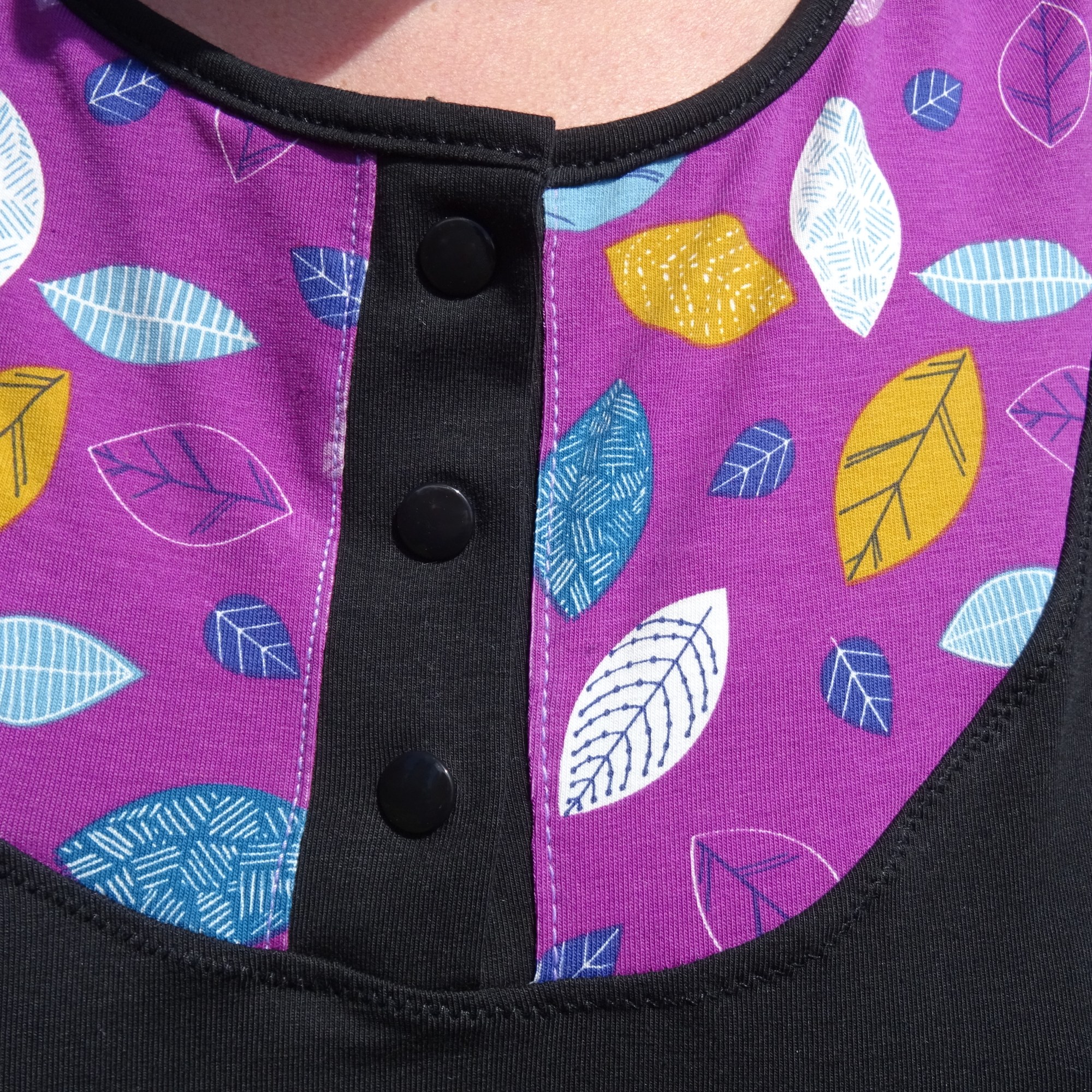 Je pourrais difficilement vous faire un pas à pas pour le montage du plastron et sa patte de boutonnage que j’ai choisi pour cette version. Pour ma part, j’ai suivi les indications, mais ma patte de boutonnage bien que fixée a un peu bougé pendant le montage et ma surpiqûre gondole un peu aussi car j’ai choisi un point zigzag 2 / 2 et c’était trop serré. J’aurais dû faire un point droit assez large de 4 ou 5 comme sur le Plantain Elle est où la mer.