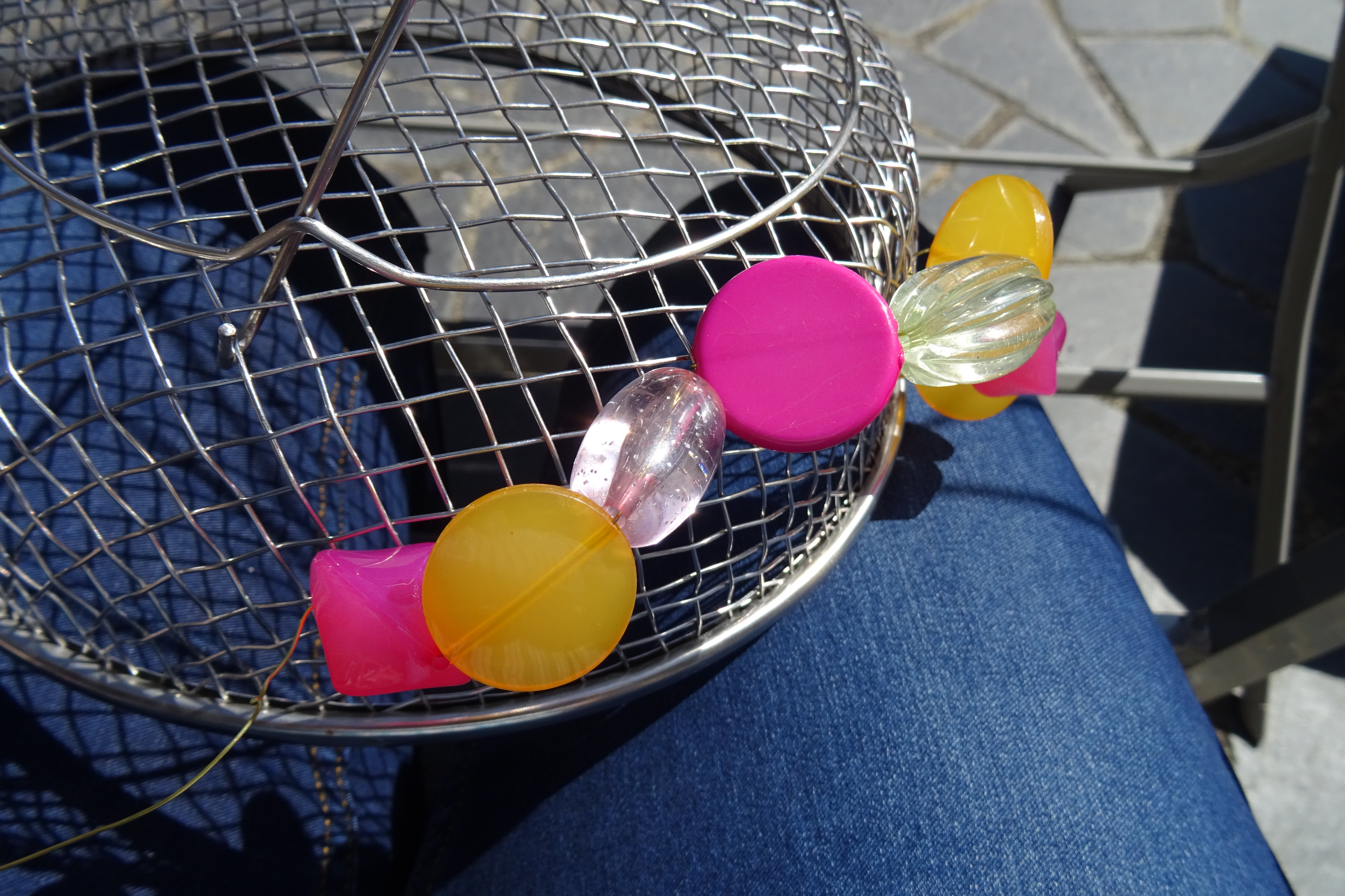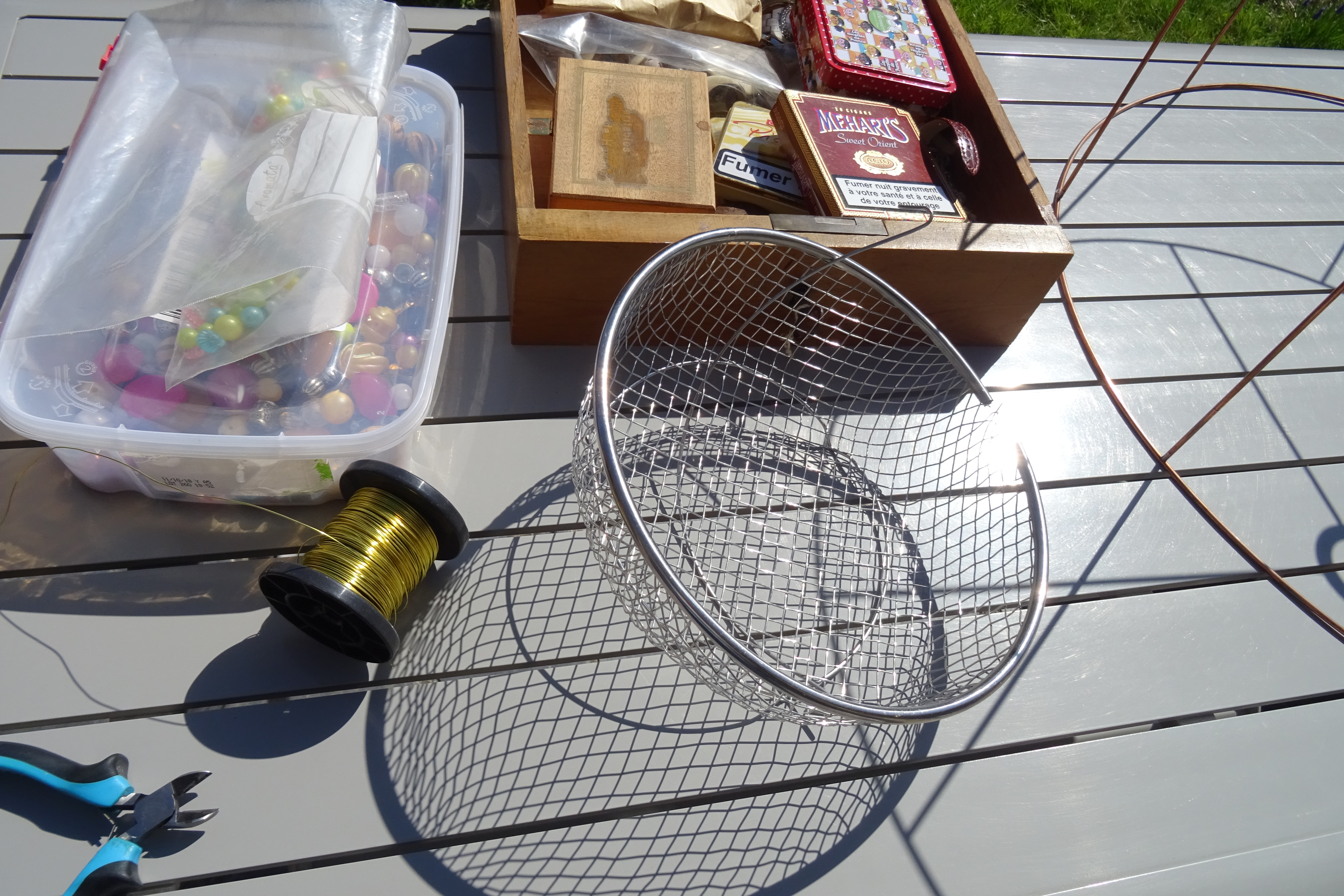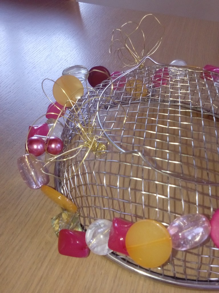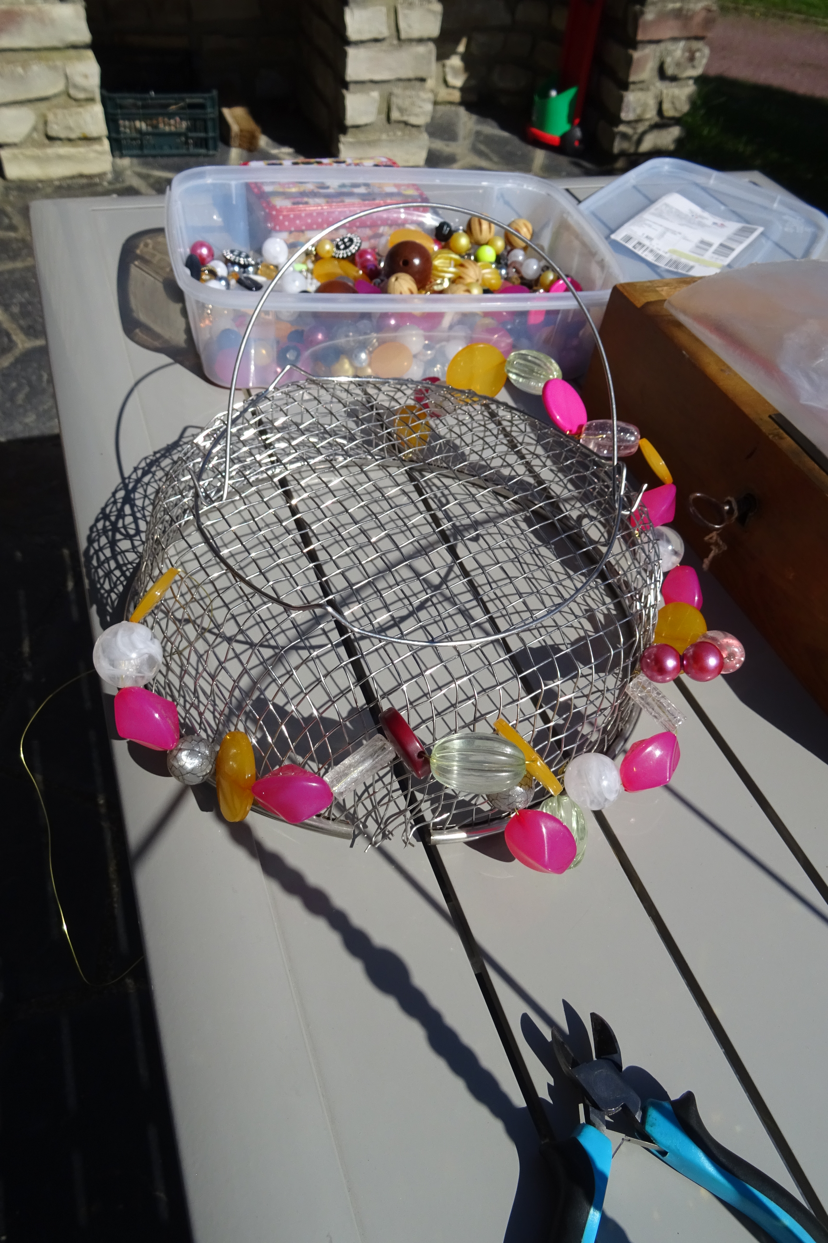 Ici un panier à frites, quelques boules colorées, du fil de laiton recuit en 0,5mm quelques tours de passe-passe plus tard et voilà le résultat…. Tralala la la.