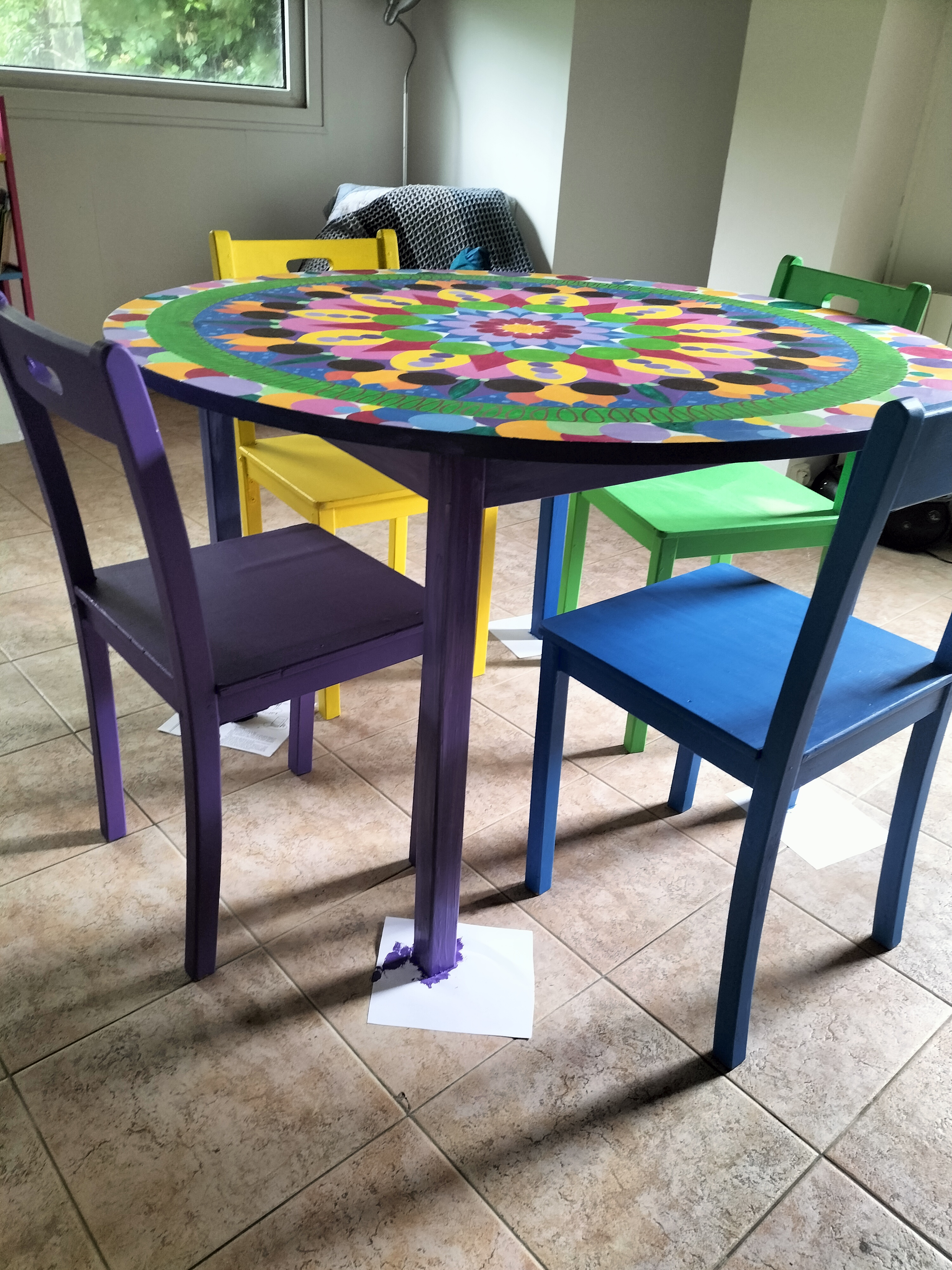 Il nous a fallu pas moins de deux mois à raison de deux à trois heures de boulot par séance, une fois par semaine parfois toutes les deux semaines en fonction de l’emploi du temps de chacune. Nous avons réussi à terminer cette table, le premier samedi de juillet juste avant le départ en vacances de la maman bénévole. Nous avons décidé de peindre également les pieds de la table et les côtés car les chaises étant également peintes cela aura gâché notre travail…