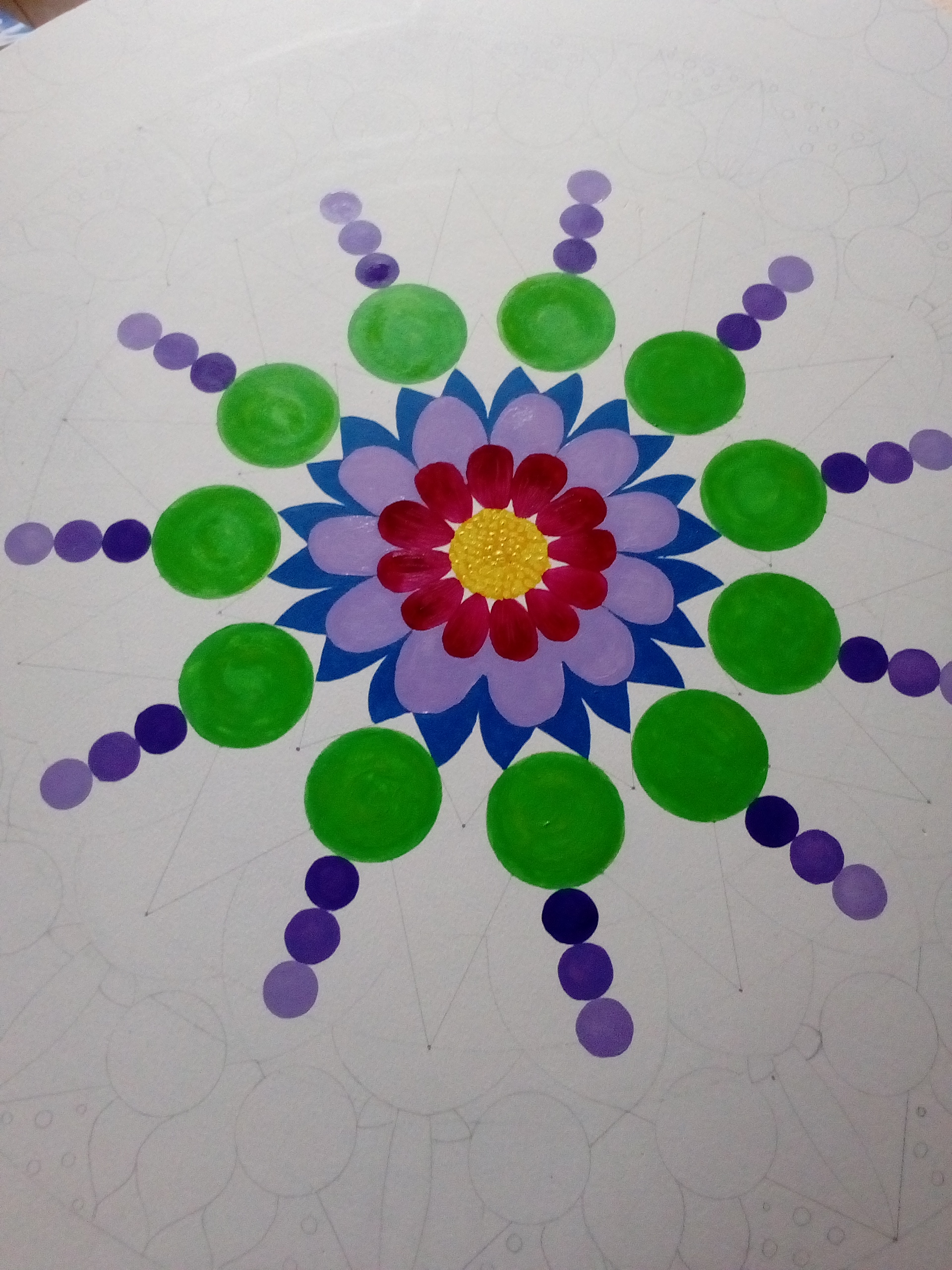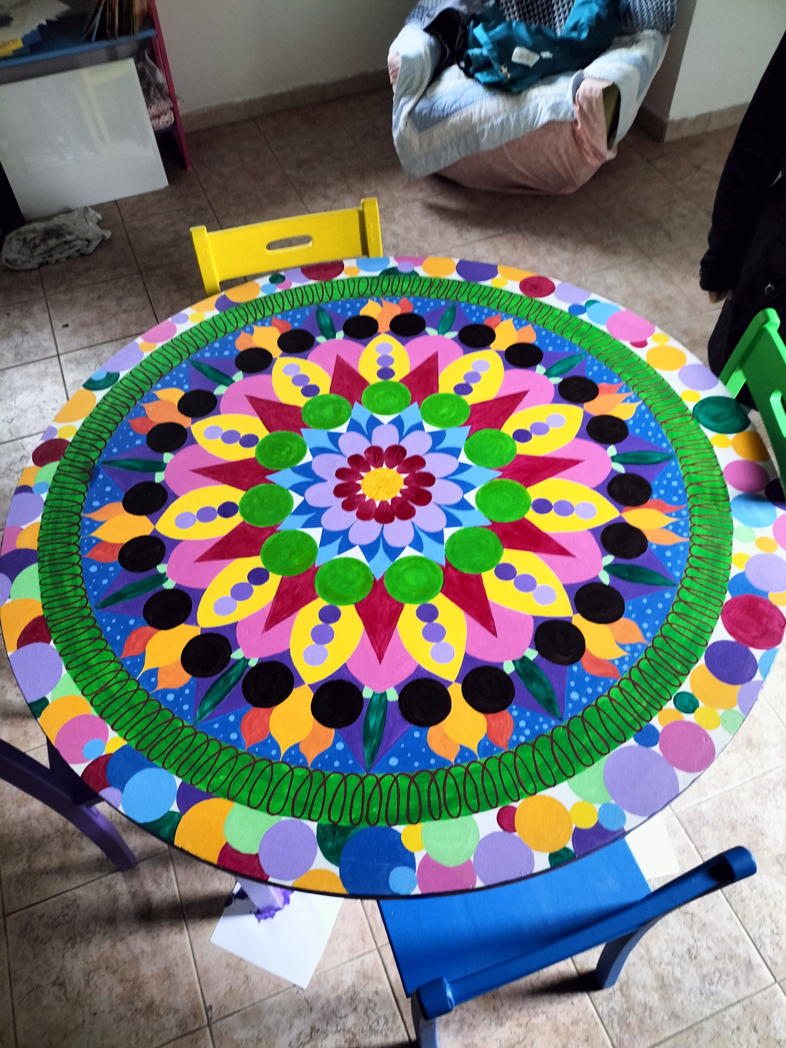 Le choix du motif a été fait à partir de croquis préparatoires que j’avais réalisés chez moi tandis que celui des couleurs s’est fait au fur et à mesure à partir de celles déjà utilisées par les autres membres de l’équipe bénévole qui s’était chargée de repeindre murs, chaises et étagères. Nous avions donc comme mission de décorer le plateau de la table. J’ai proposé un mandala vu que le plateau était rond cela m’a paru être une proposition appropriée. La responsable du chantier, salariée de l’association et en charge des actions « familles » a validé cette proposition ainsi que ma partenaire de décoration.