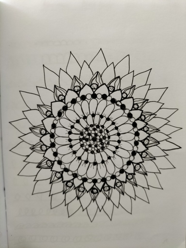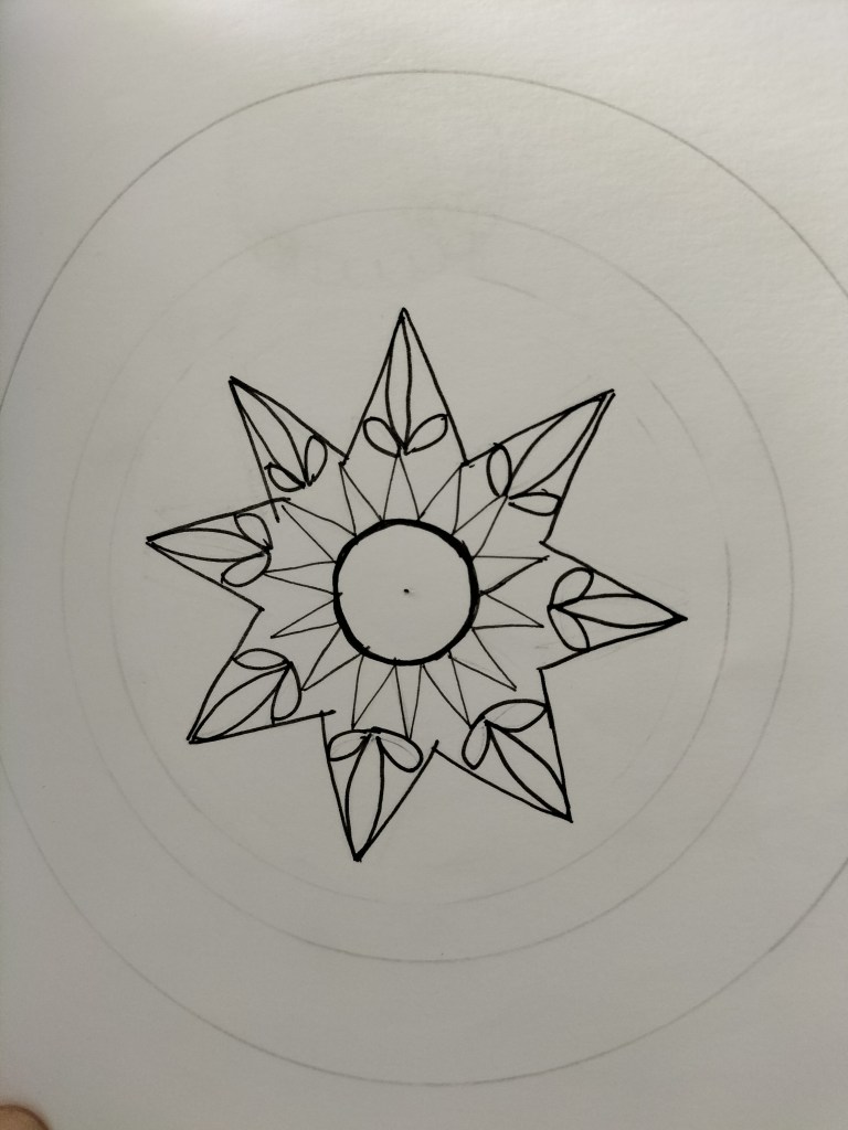 C’est un travail de peinture très minutieux et qui demande beaucoup de concentration pour contrôler la main et ajuster le geste. Les pinceaux utilisés étaient parfois très fin. Comme la peinture acrylique était parfois trop épaisse il a fallu la diluer avec un peu d’eau. Pour éviter les temps de séchage trop important, et nous coller de la peinture partout, nous peignons les motifs un rang sur deux, du centre vers l’extrémité du cercle et finissions par les bulles autour. Le motif des boucles sur le cercle extérieur a été dessiné au posca marron par ma coéquipière déco car c’était impossible de le faire au pinceau à cause de la précision que cela demandait dans la gestuelle.