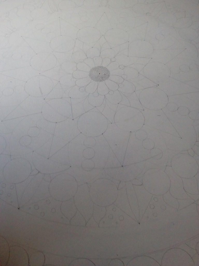 Pour le report du motif sur la table, cela fut un peu plus fastidieux qu’un simple dessin à main levée sur un carnet de croquis ! Il a fallu trouver quelques solutions pour centrer le motif sans mètre mesureur et les dessiner de manière régulière. A nous les bouts de ficelles, les verres, soucoupes et bouchons de bâton de colle pour tracer des cercles parfaits ! Vive la débrouillardise, le système D comme on dit. Le résultat est bluffant.