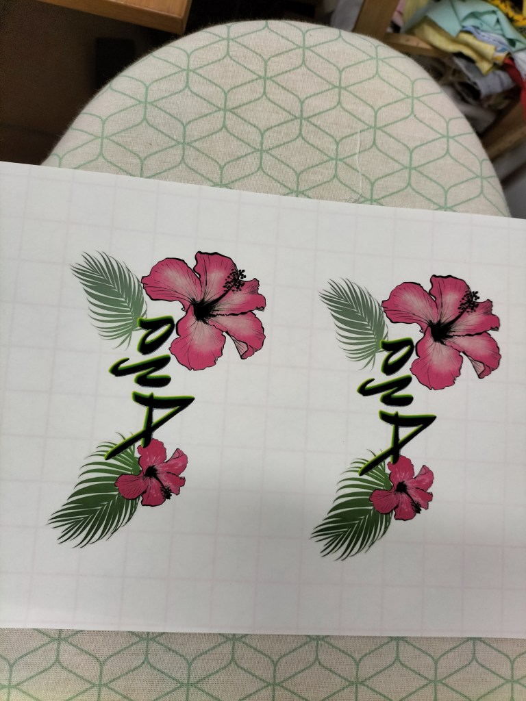 J’avais acheté des feuilles de transfert pour des projets broderie (pour le moment toujours pas réalisés hum hum), c’était donc l’occasion de me mettre à la création. Mamz’elle m’inspire toujours des motifs exotiques avec son teint mat, ses yeux de velours et ses cheveux de vahinés, les fleurs d’hibiscus étaient toutes trouvées pour lui coller à la peau ! Quelques modifications de dessins trouvés sur le net, colorisées avec une application de retouche photo gratuites plus tard… ces fleurs se sont posées sur les pochons pour une belle vie de voyages !