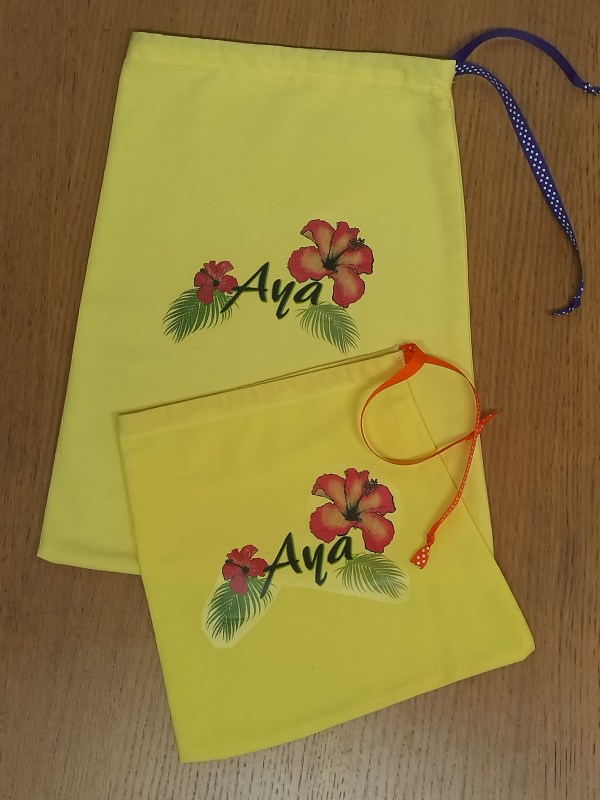 En commençant, par aujourd’hui, avec ces pochons que j’ai cousus et personnalisés pour ma fille aînée en juin dernier pour sa sortie scolaire de fin d’année. Elle pourra s’en resservir aisément pour y mettre son linge sale et ses petites affaires fragiles lorsqu’elle part en vacances.