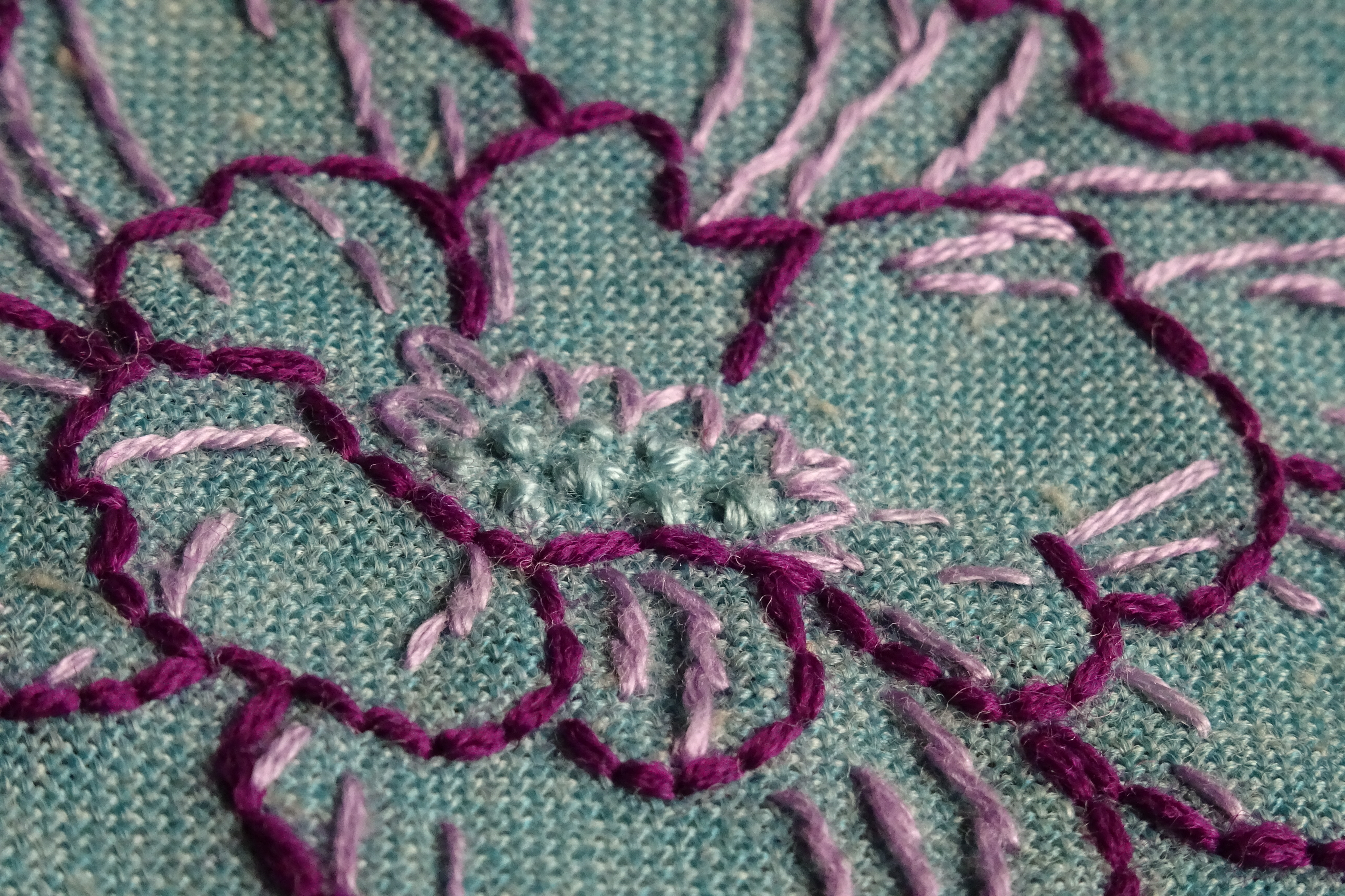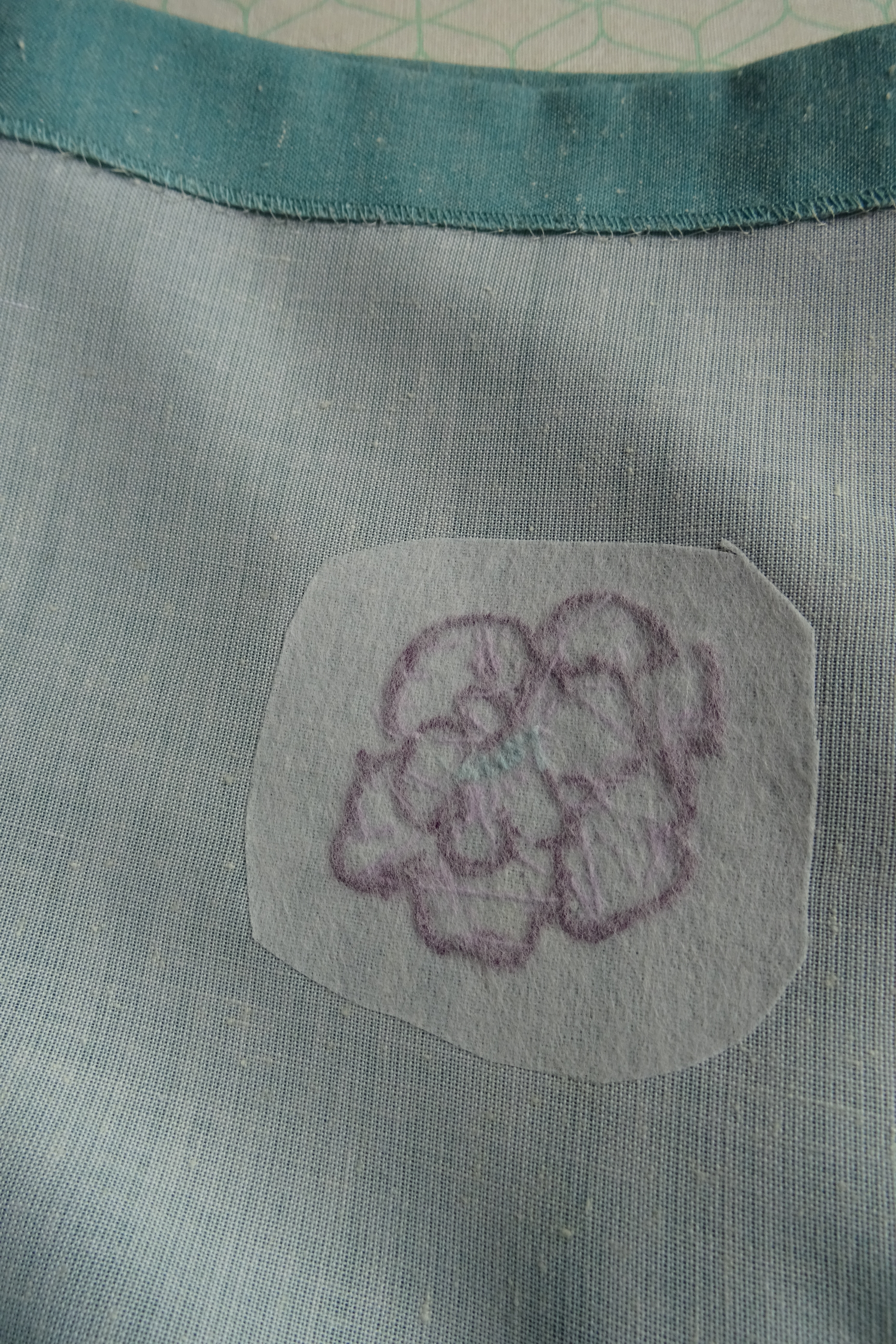 J’ai proposé à Mamz’elle de broder un modèle de fleurs de pivoine que j’avais sur un magazine et qui rappelait bien celles du tissu d’ailleurs. J’ai renforcé avec de l’entoilage très fin pour éviter que les frottements sur la broderie l’use trop vite (ce serait bien que Mistinguette puisse le porter dans quelques années !)