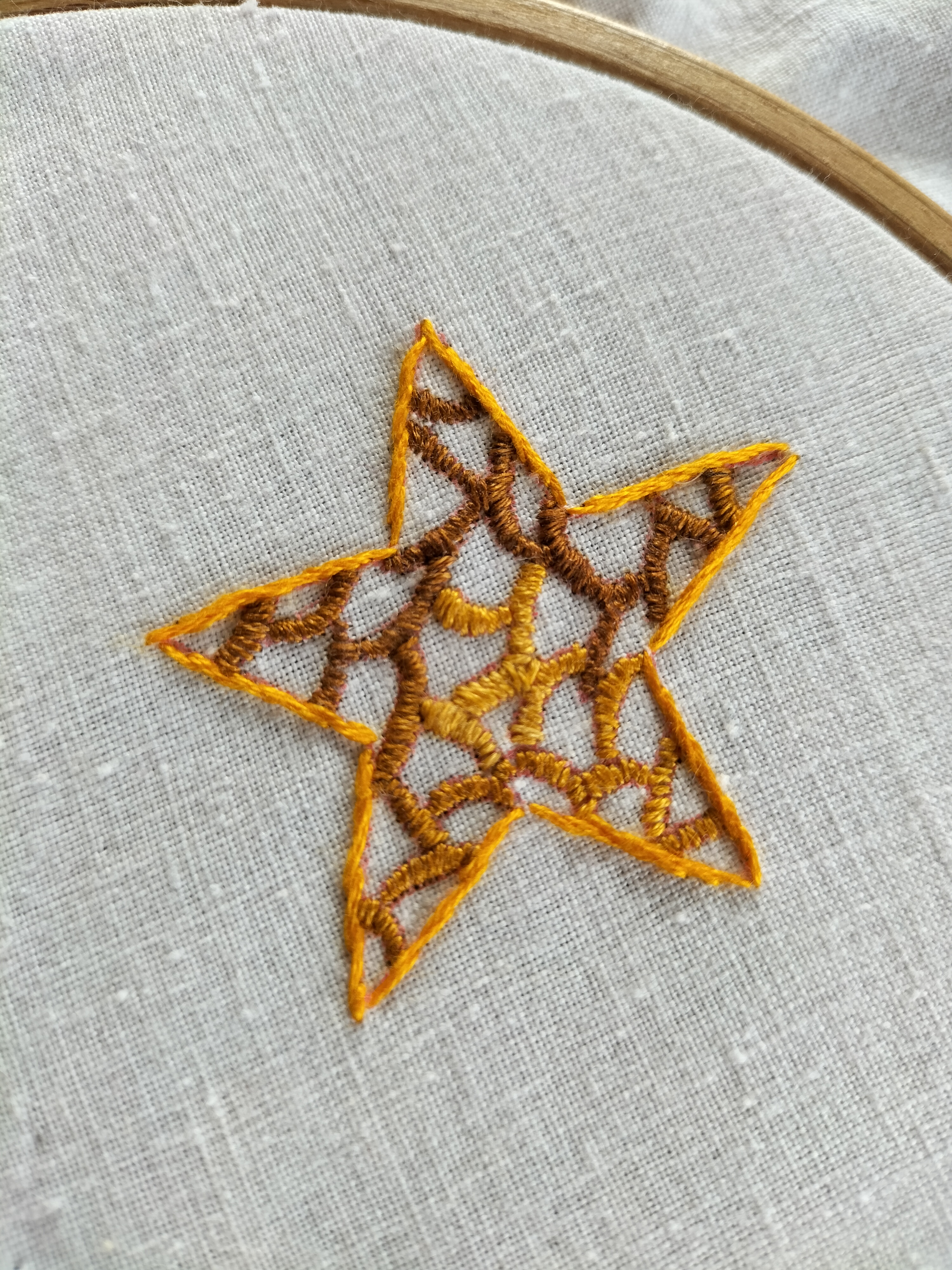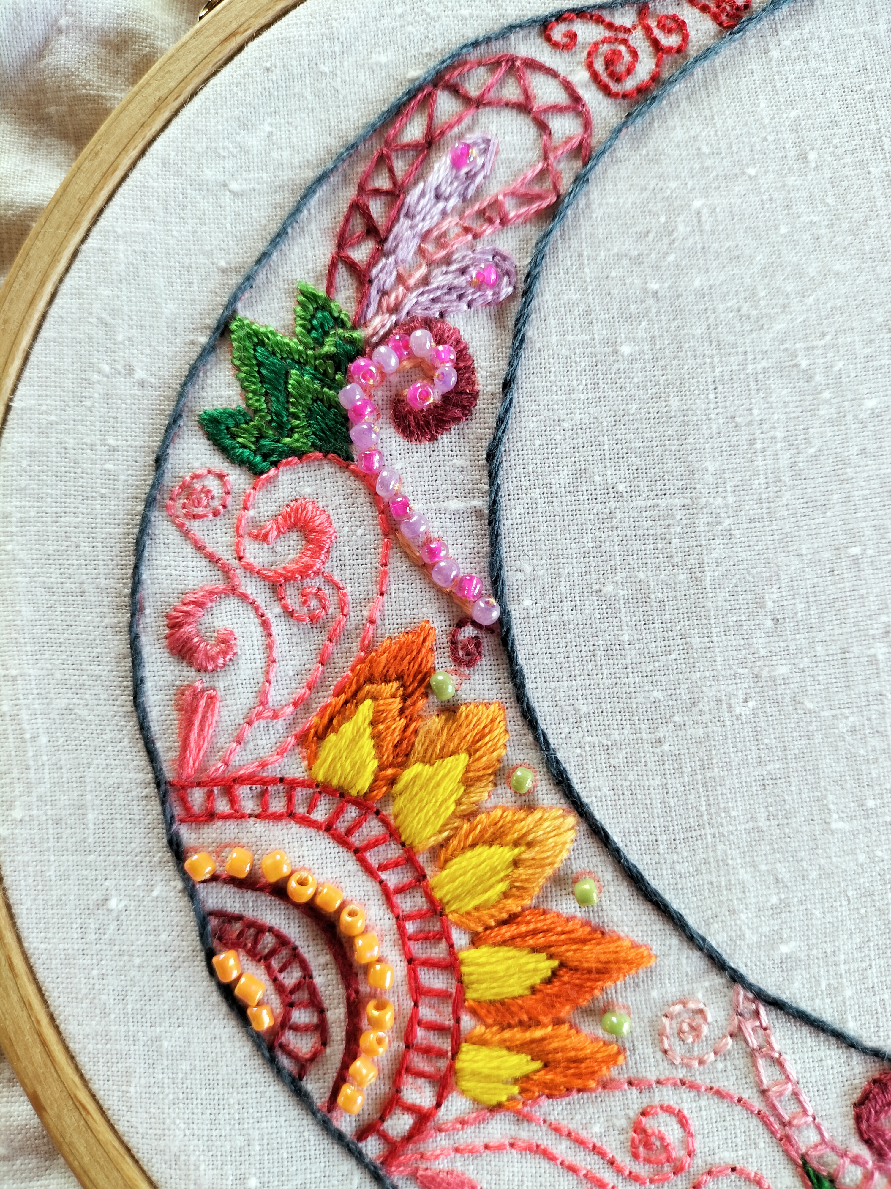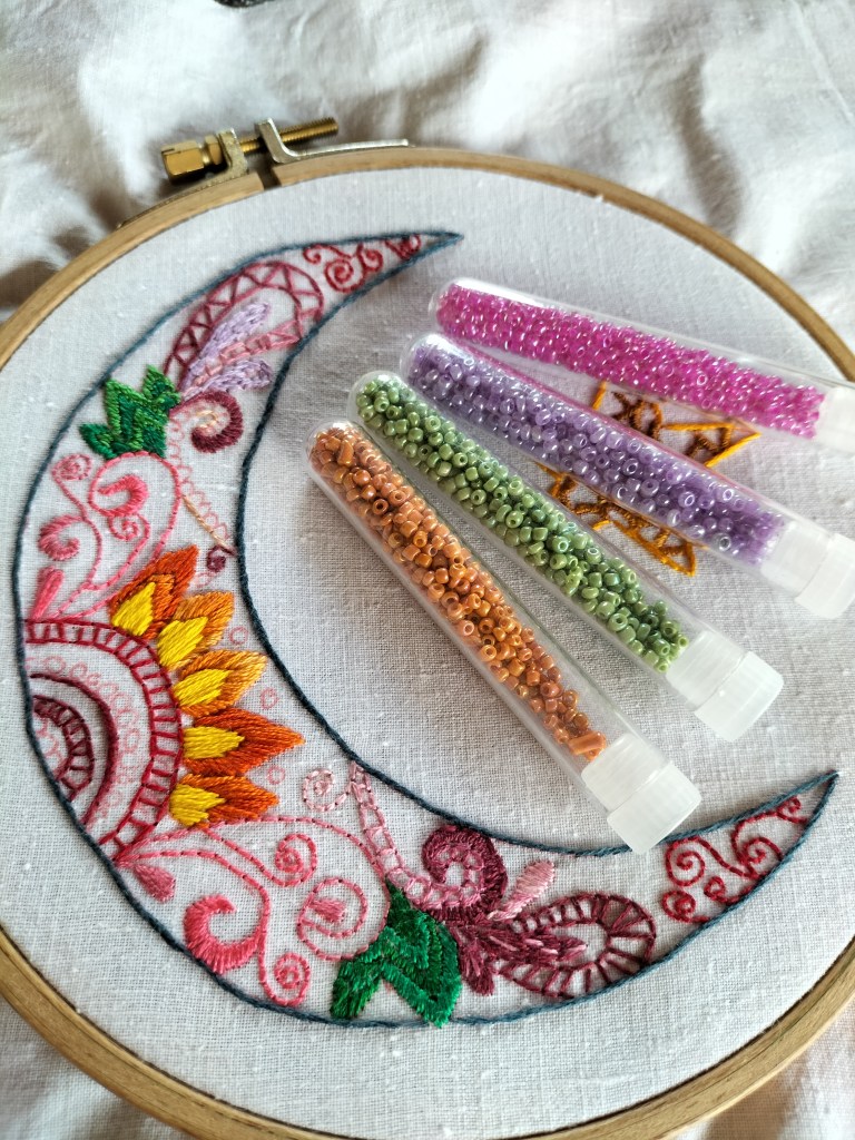 J’ai ajouté des perles de couleurs, je me souviens avoir pris vraiment du plaisir à broder ce motif qui permets de jouer avec les coloris, les nuances.