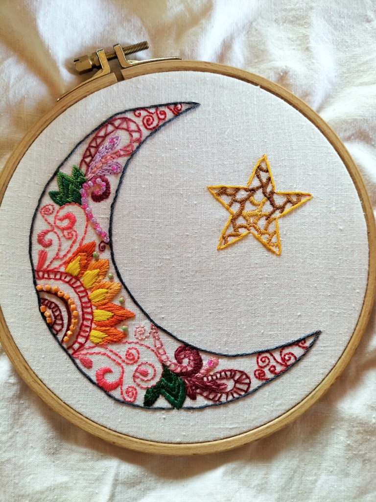 En avril dernier (han déjà !) j’ai décidé de faire cette broderie décorative sur le thème de la lune car c’est un astre important dans plusieurs cultures. Il y a dans certains pays un calendrier lunaire avec lequel les fêtes religieuses sont calculées. J’ai donc voulu rendre un hommage à cet astre merveilleux, lumineux qui accompagnent aussi la vie d’une femme, qui a une influence également sur notre sommeil.