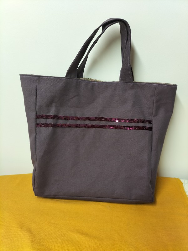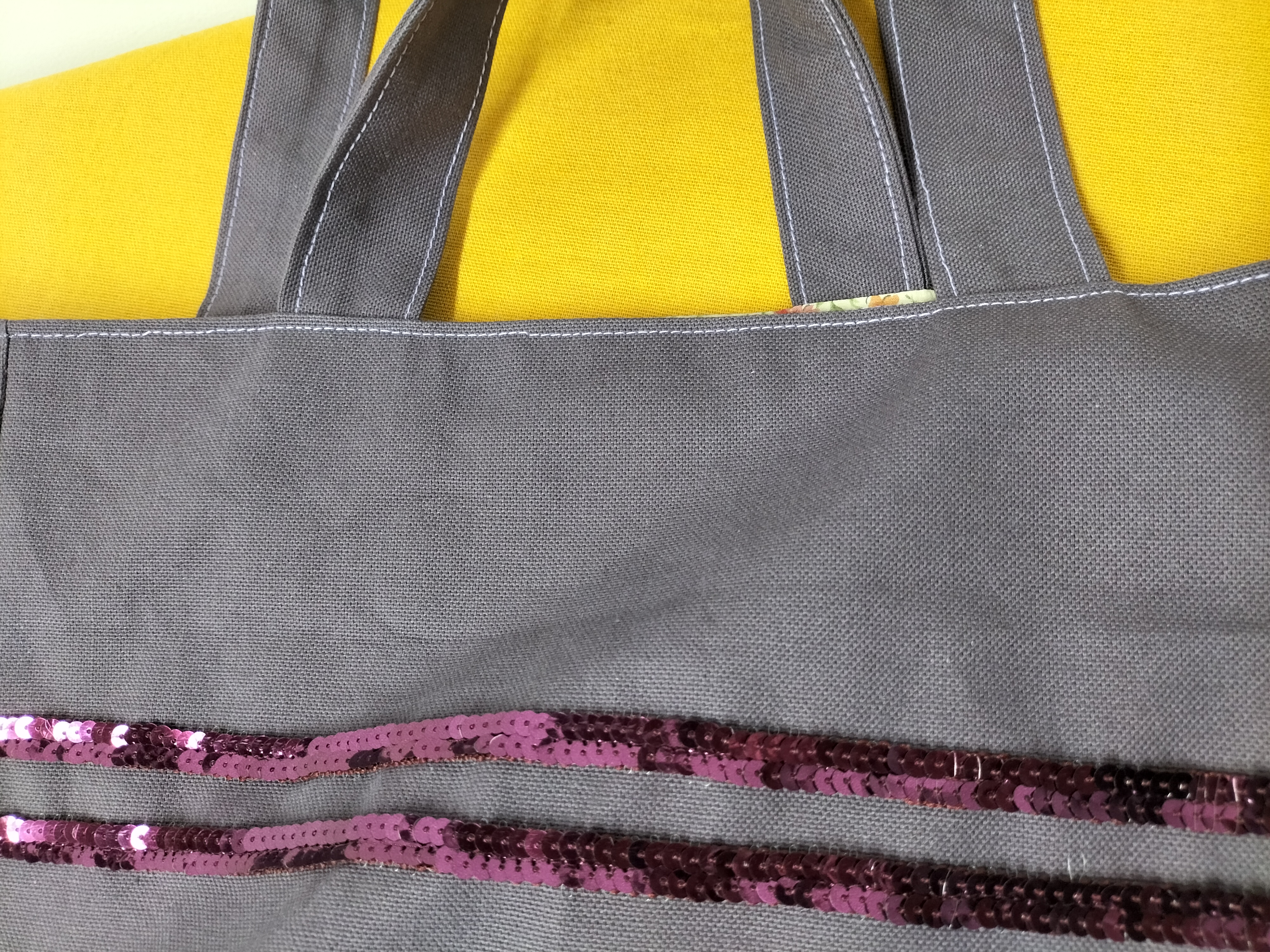 Je souhaitais utiliser le ruban sequin bien que les broderies du modèle me plaisaient énormément. Nous sommes parties sur un modèle simple et discret bien que féminin pour qu’elle puisse l’utiliser plus longtemps. J’ai gardé la forme carrée du modèle, la mesure des anses et agrandit la profondeur qui initialement devait être de 10 cm. Cela lui permettra de mettre plus de livres !
