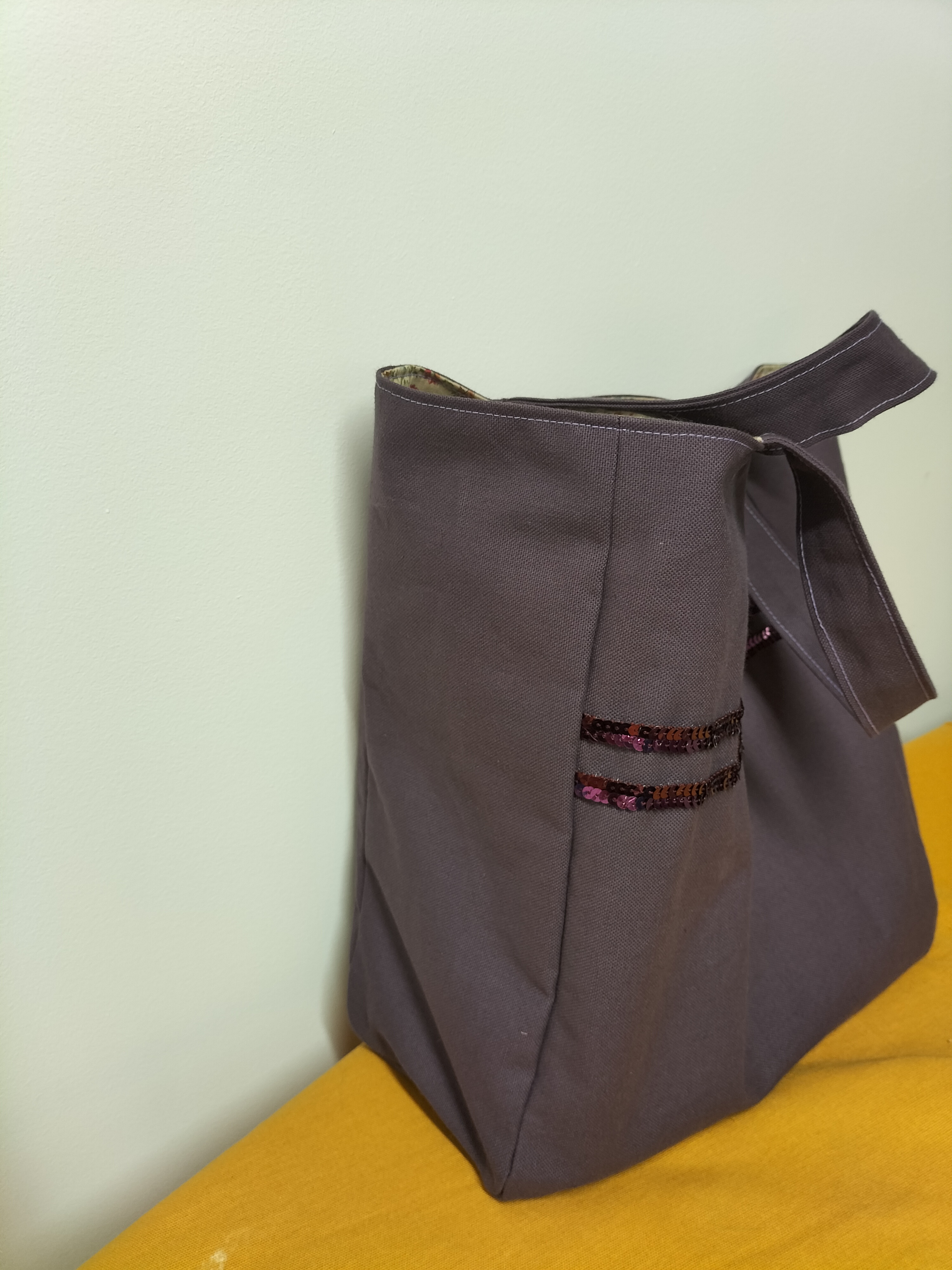 Le sac mesure 33 X 33 cm et a une profondeur de 17 cm environ. Cousu dans une belle cotonnade épaisse en mauve uni pour l’extérieur (moins salissant que le blanc !) et un coton plus fin à fleurs pour la doublure assorti à un ruban de sequin brillant violet.