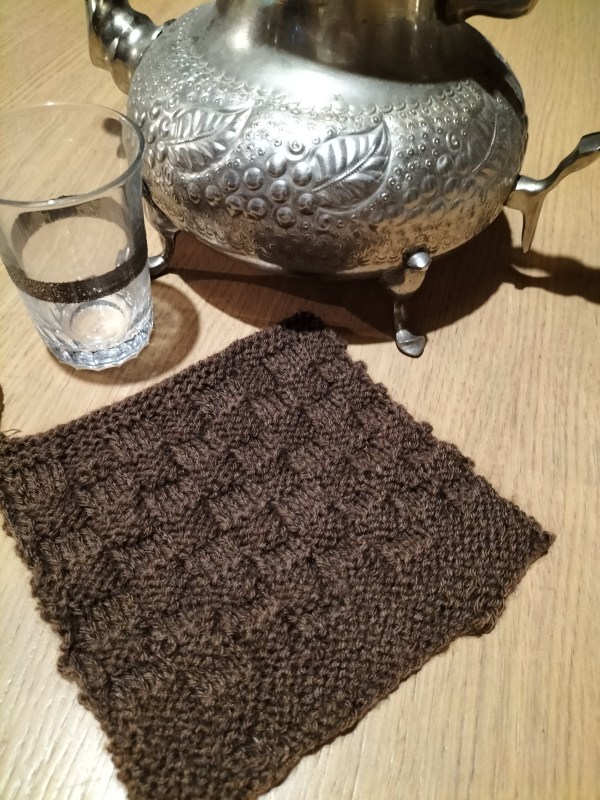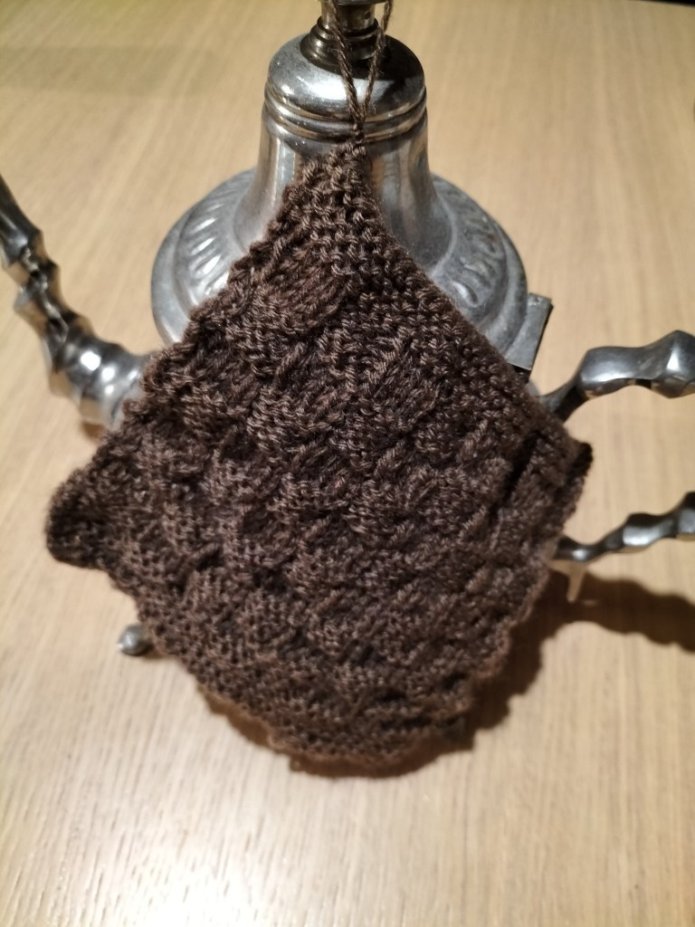 Une pelote de marron glacé orpheline pour réaliser deux maniques ou dessous de tasse à thé c’est selon l’envie et le besoin.
