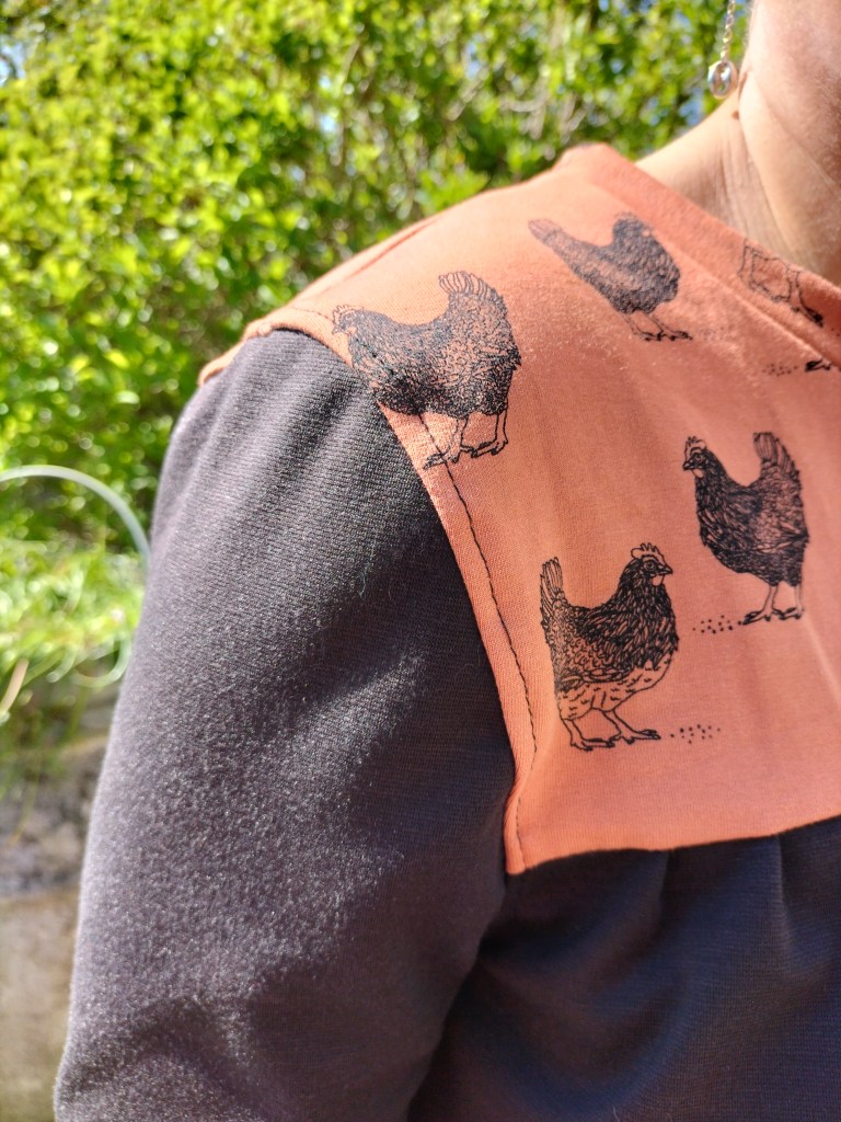 D’autant plus que j’avais du jersey neuf qui attendait son tour… Un jersey sweat de fou avec des poules qui trainait par là (une chute de 20 cm achetée chez Mondial Tissu un jour d’inspiration) et un second Milano acheté dans un autre magasin ont croisé leur chemin et ça donne cela : un Gaston tout beau tout rond. Un Gaston de vrai patron(ne) !