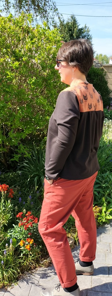 J’ai lu au préalable les instructions qui ne diffèrent pas beaucoup du tee-shirt de Deer and Doe. J’ai assemblé la partie haute avec la partie basse plus sombre (ce n’est pas noir mais brun foncé) ensuite les épaules puis l’encolure qui est très réussie 😊. Tout s’est cousu de manière simple et rapide, c’est impeccable. Je suis très fière de moi…