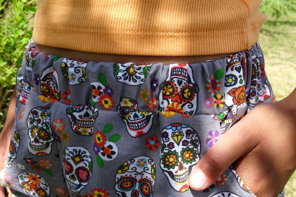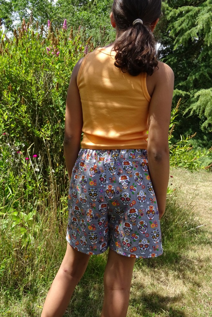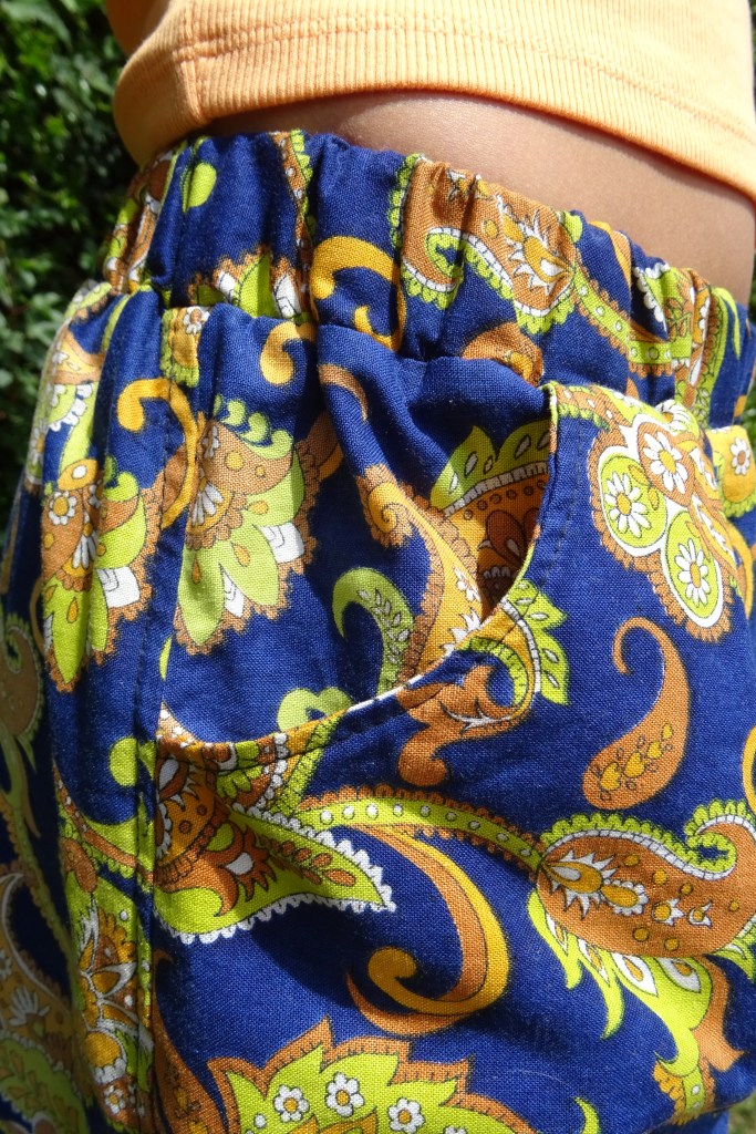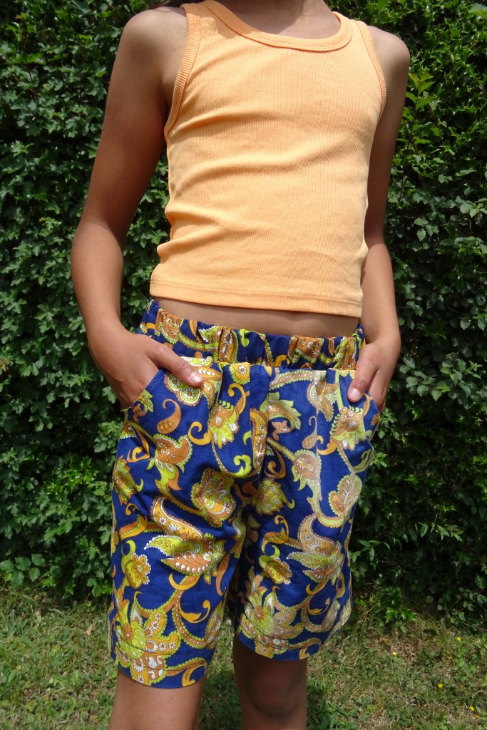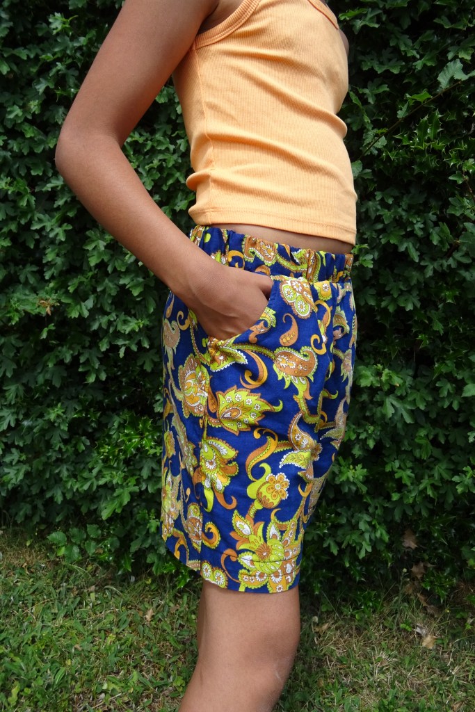 J’ai donc choisi celui-ci avec des gros motifs ors et orangés sur fond bleu marine pour faire une toile histoire de me rassurer sur le patron. Il est un peu délavé ce qui me fait penser que ce fut peut-être un rideau. J’ai utilisé l’ourlet qui existait déjà, ce qui donne une version longue type bermuda. Au départ, Mamz’elle ne voulait pas de poches mais un bermuda sans poche, c’est moche ! Donc, je lui en ai fait quand même et tout compte fait elle l’a adopté sans trop sourciller… La ceinture est assez large pour faire passer un élastique de 3 cm ce qui est très confortable, cela ne coupe pas la respiration ni ne serre trop la taille. C’est une largeur parfaite !