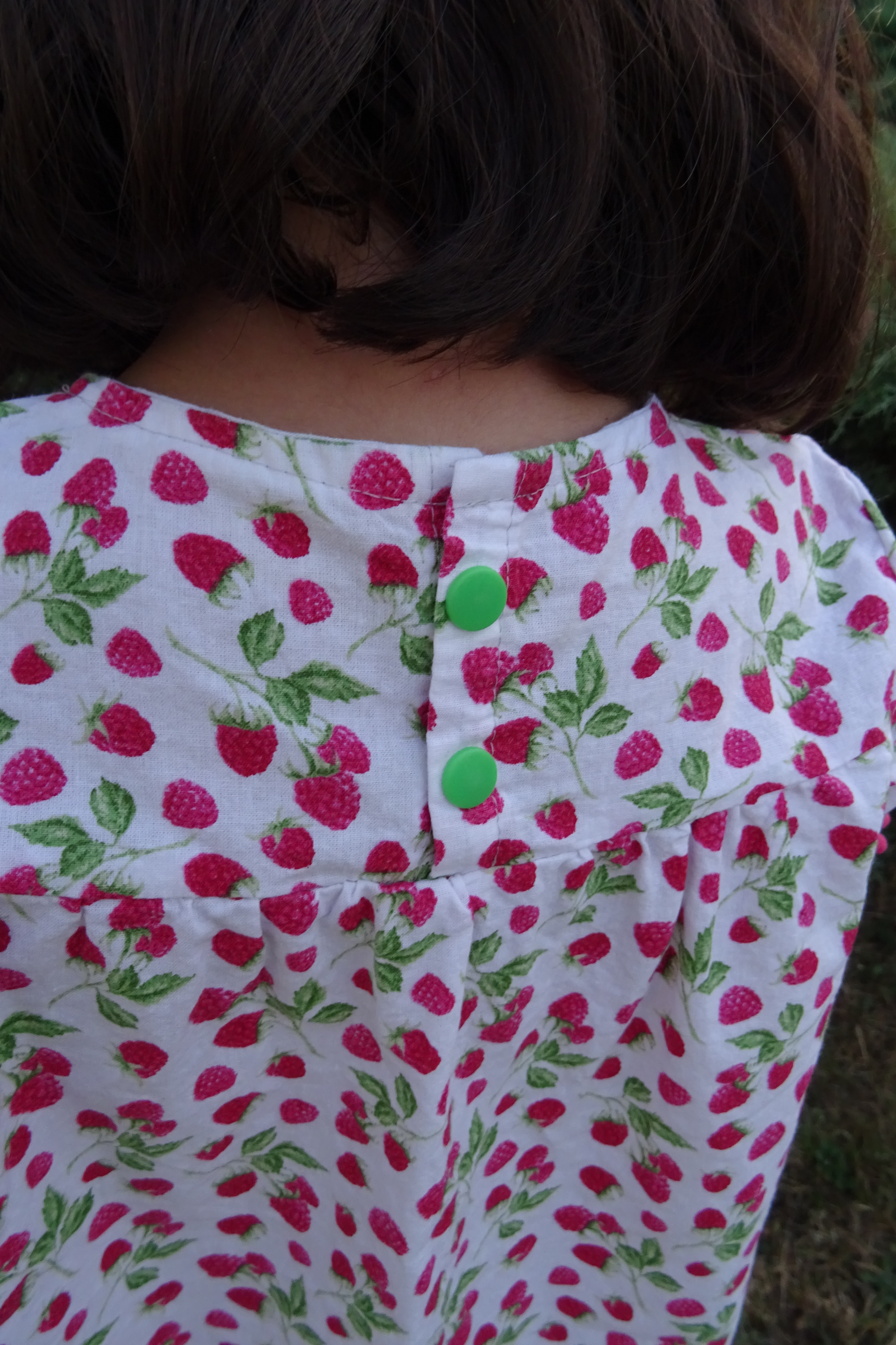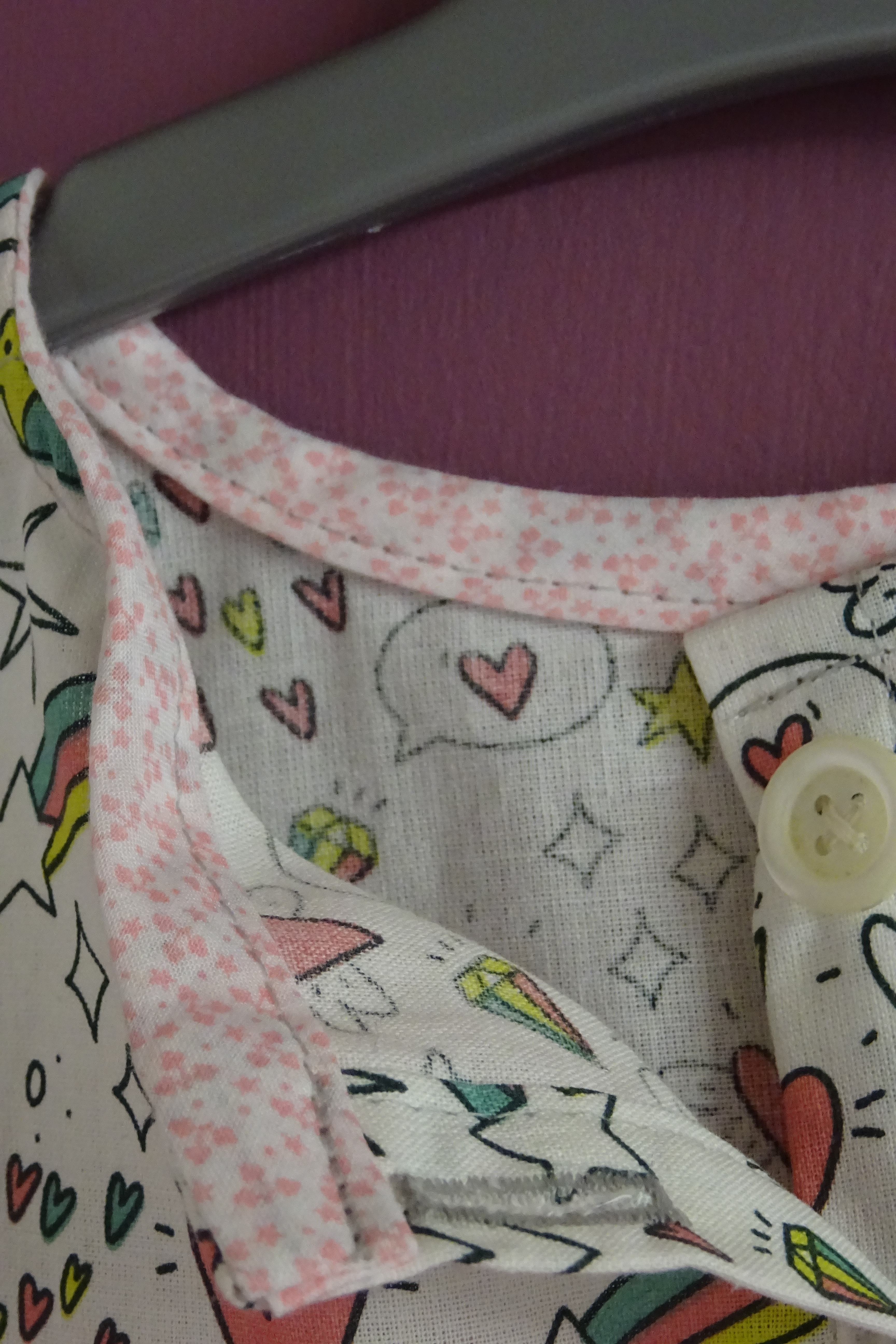 J’ai également ajouter cinq cm pour augmenter la largeur du haut et faire plus de fronces car je trouve que le modèle initial en manque (seul défaut du patron). Les couleurs sont très bien assorties ensemble et iront à ravir à la petite blondinette E. Sur ce modèle, j’ai soigné les finitions : ourlet au biais, boutonnières, boutons de nacre, couture anglaise pour les côtés… J’ai un peu galéré avec l’ourlet du bas, le tissu rose doit être de composition chimique car il glissait sous le fer et pas moyen d’aplanir les plis !