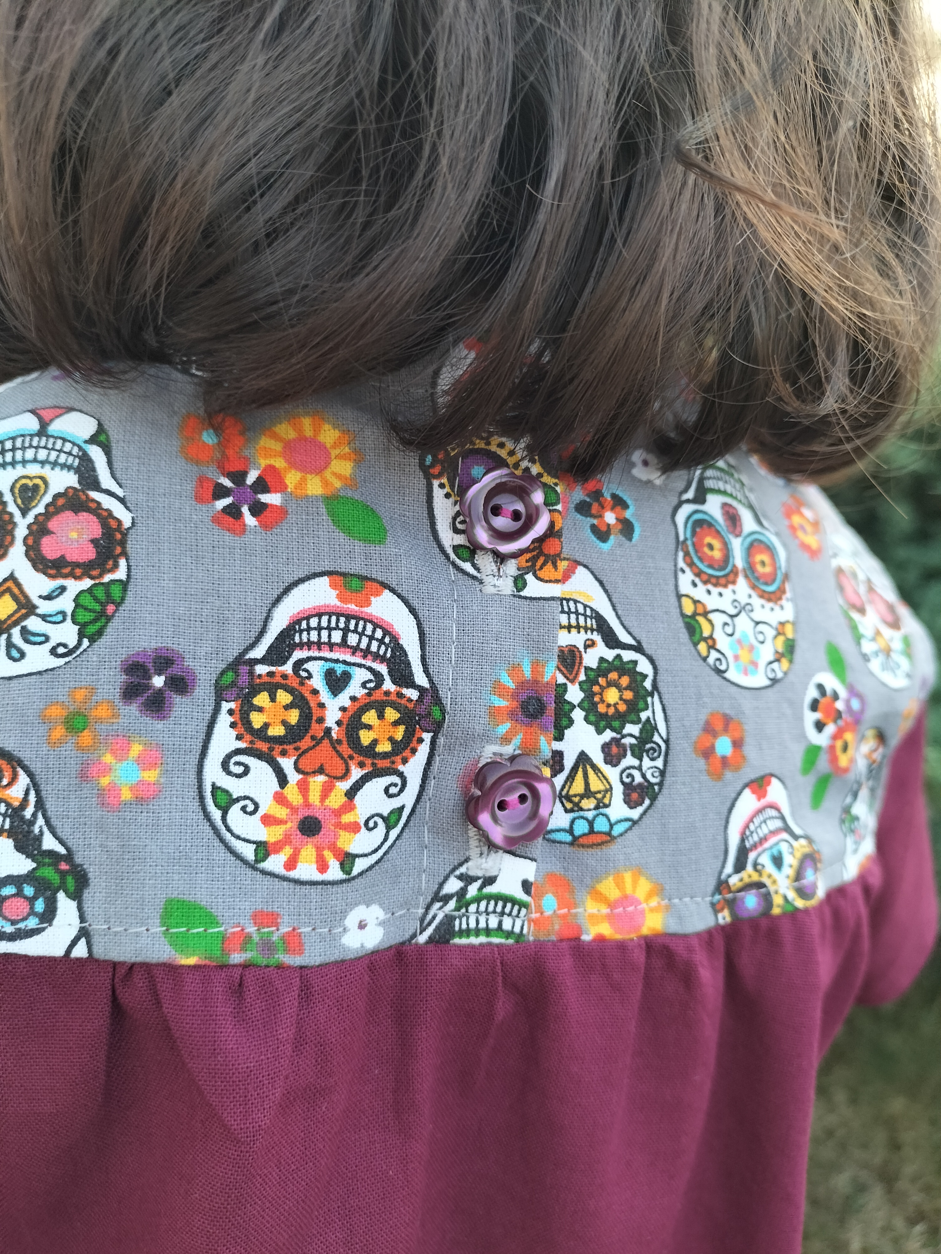 Le hic sur ce modèle c’est que les deux morceaux dos ont les motifs de têtes de mort à l’envers. A la coupe je n’ai pas fait attention et j’ai mal coupé. J’aurais pu refaire car il me reste tout juste assez de tissu pour mais non j’ai laissé comme tel car Mamz’elle m’a dit « c’est pas grave maman si elle est pour moi mais pour E. c’est embêtant quand même, elle risque de ne pas aimer ! »