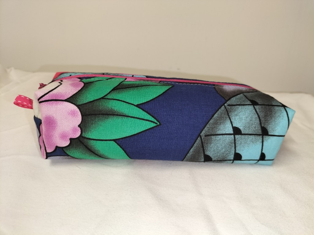 Une belle trousse colorée et fruitée pour la maitresse selon le modèle déjà testé de la trousse carrée ! Tout est recyclé, du tissu à la fermeture zippée. L’intérieur a été soigné avec de belles finitions au biais. Ce que j’aime dans ces accessoires réalisés avec des tissus à gros motifs c’est que chaque face est différente.