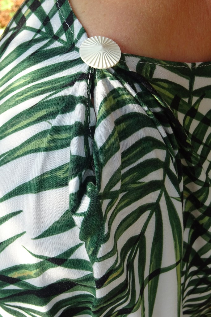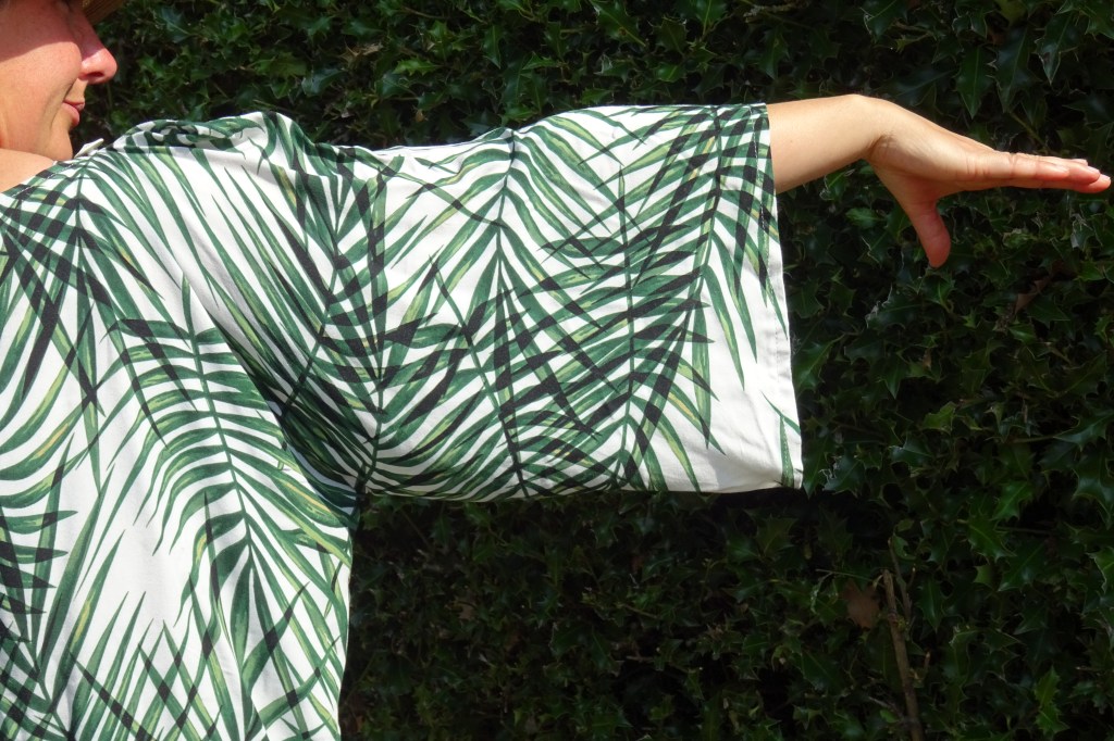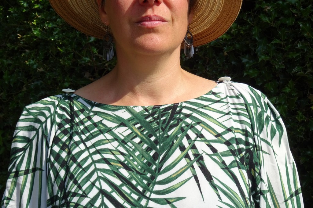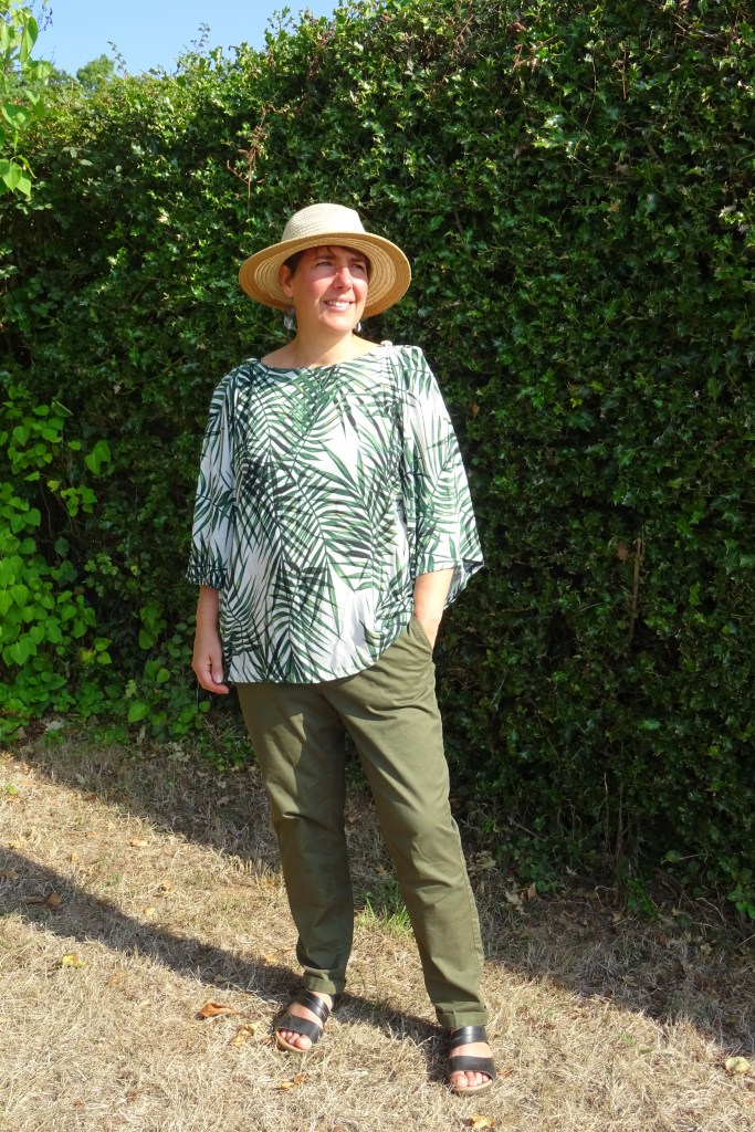 Il attendait sagement dans mon stock de trouver le bon moment pour être cousu. J’ai hésité longtemps sur le patron à employer sur ce petit coupon (1m x 1.25m). Et pour terminer j’ai créé moi-même ce modèle en prenant le tuto d’un kimono ou bien de deux et du haut à la mode antique. J’ai mixé le tout et ça donne un haut large avec une encolure « bateau » et manche kimono. Les boutons sont issus de mon stock recyclage, ils me font penser au chapeau de paille de riz des asiatiques ☺. Ils ont été placés à cet endroit pour resserrer l’encolure qui était trop grande et garder cet esprit antique aussi. Le défaut c’est que je trouve que cela me fait des épaules de camionneuse… j’aurais dû aller jusqu’au bout de l’idée de la mode antique… en ouvrant la manche jusqu’au poignet et en refermant avec des boutons régulièrement.
