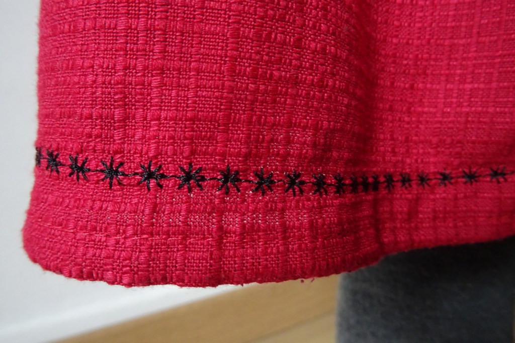 Pour cette version hiver cousue en octobre afin d’en profiter, j’ai utilisé du velours noir texturé épais pour le haut que j’avais en stock et qui m’avait été donné en 2018 de même que la cotonnade rouge texturée assez épaisse également. J’ai ajouté du biais rouge et blanc à carreaux pour mettre une petite touche chic et originale, deux beaux boutons et comme sur la première robe que je lui avais cousue en 2020, j’ai ajouté une broderie machine avec le fameux fil de la marque Madeira ET qui ne s’est pas cassé cette fois-ci… comme quoi rien n’est jamais certain dans la vie… Cette robe ne tourne pas au sens premier du terme ce n’est pas une robe « patineuse » mais elle gonfle en tournant.