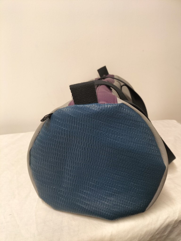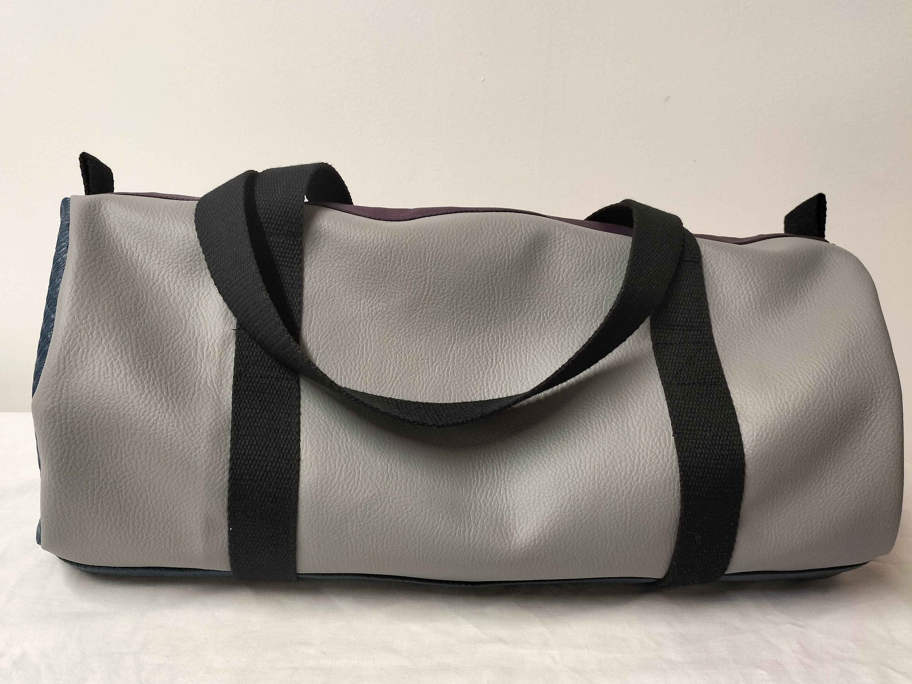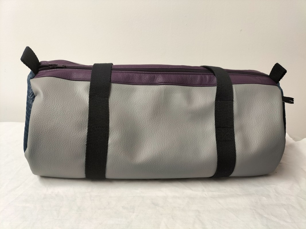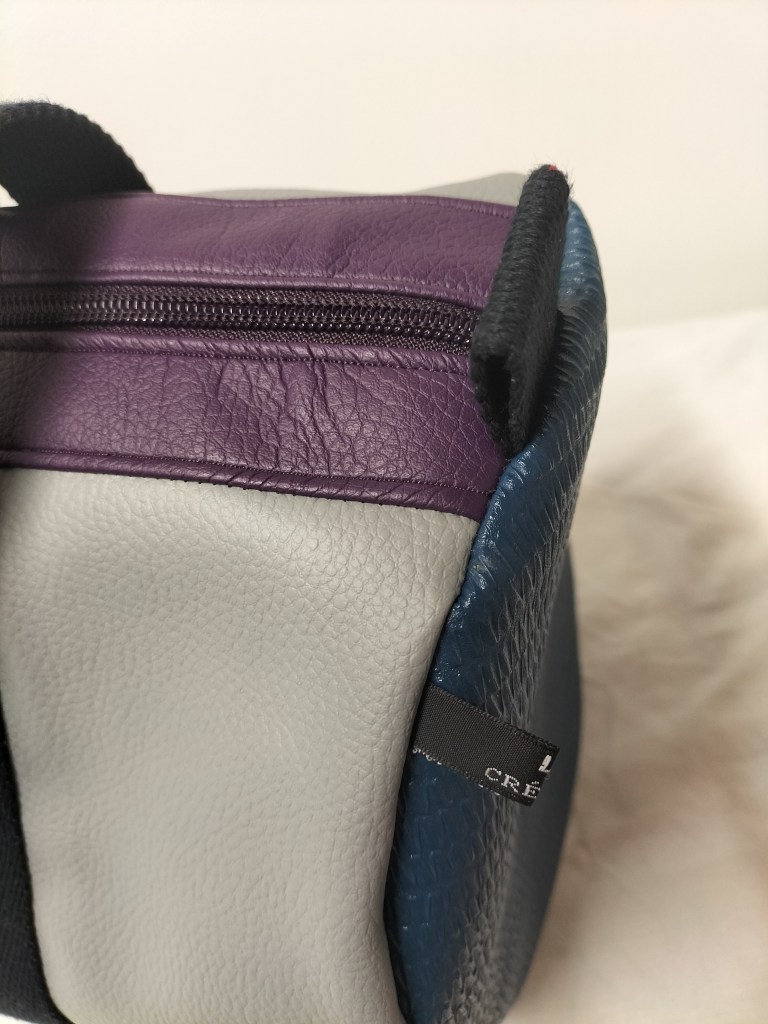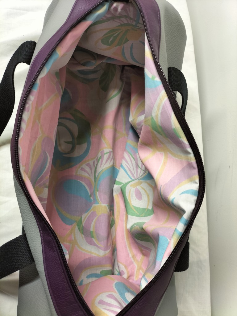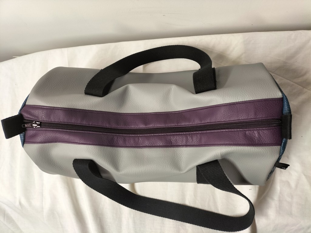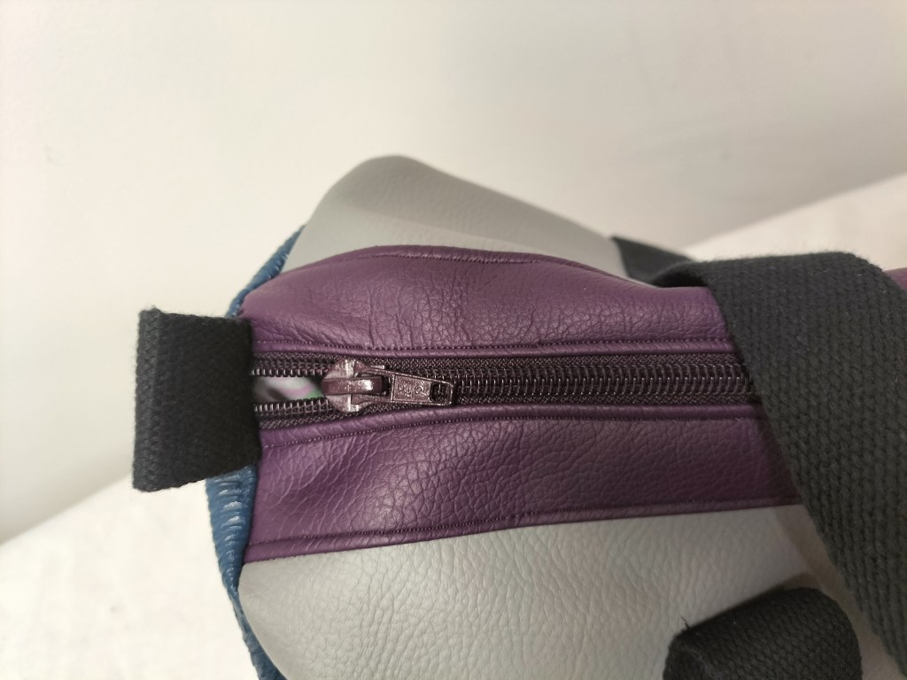 Bon revenons à notre polochon, pour lequel j’ai principalement utilisé des morceaux plus au moins grands qui me restaient : du simili cuir texturé couleur vert/bleu canard, du gris clair et du mauve. J’ai utilisé une fermeture zippée mauve que j’avais en stock et que je devais utilisée au départ pour ce sac en 2019 ! Le tissu doublure est un coton à fond blanc à grosses fleurs un peu vintage dans des coloris style années 80′. Seule la sangle en coton noir a été achetée neuve à la mercerie. Avec des minis chutes de sangle j’ai cousu des petites poignées ou aide à la fermeture (ci-dessous).