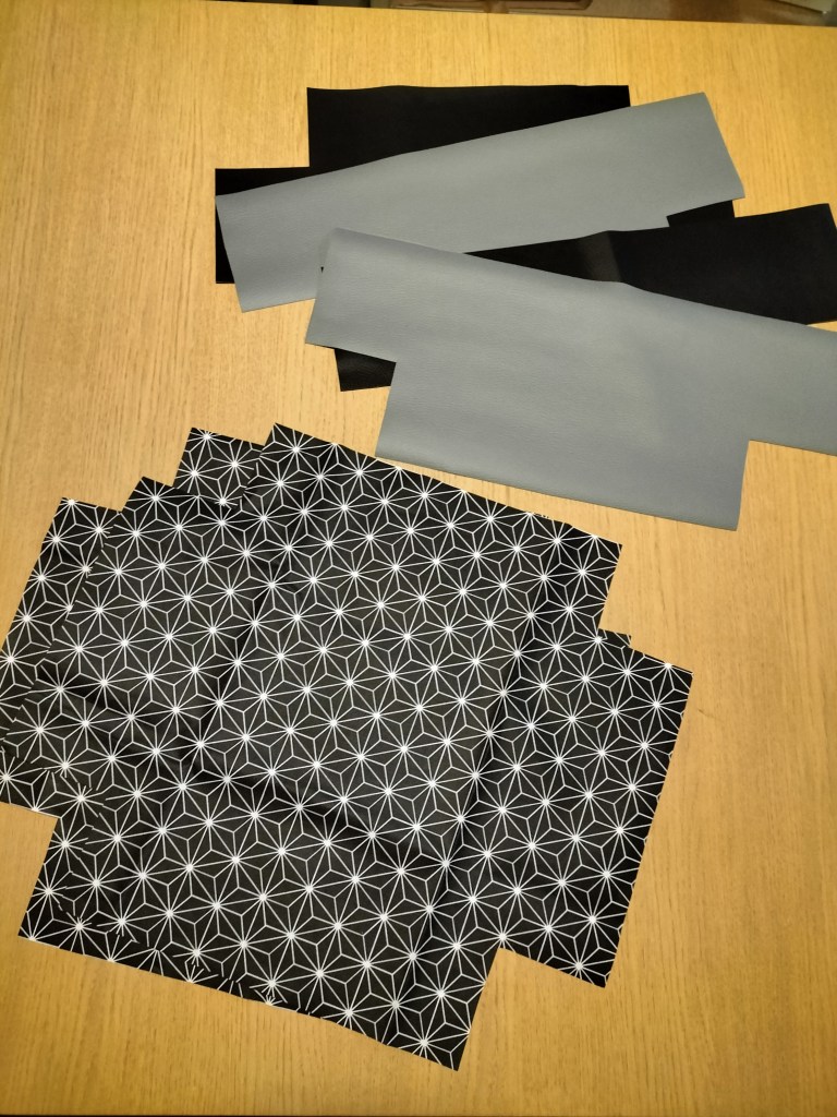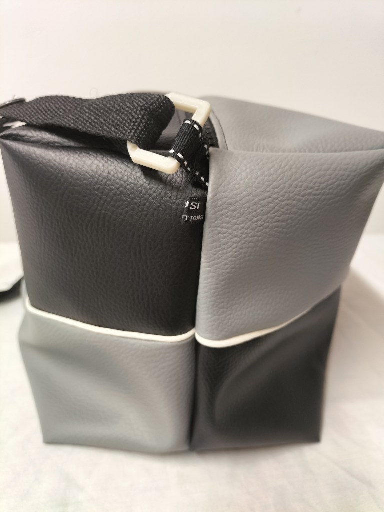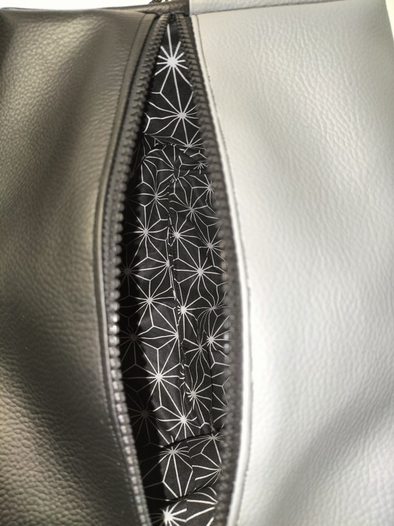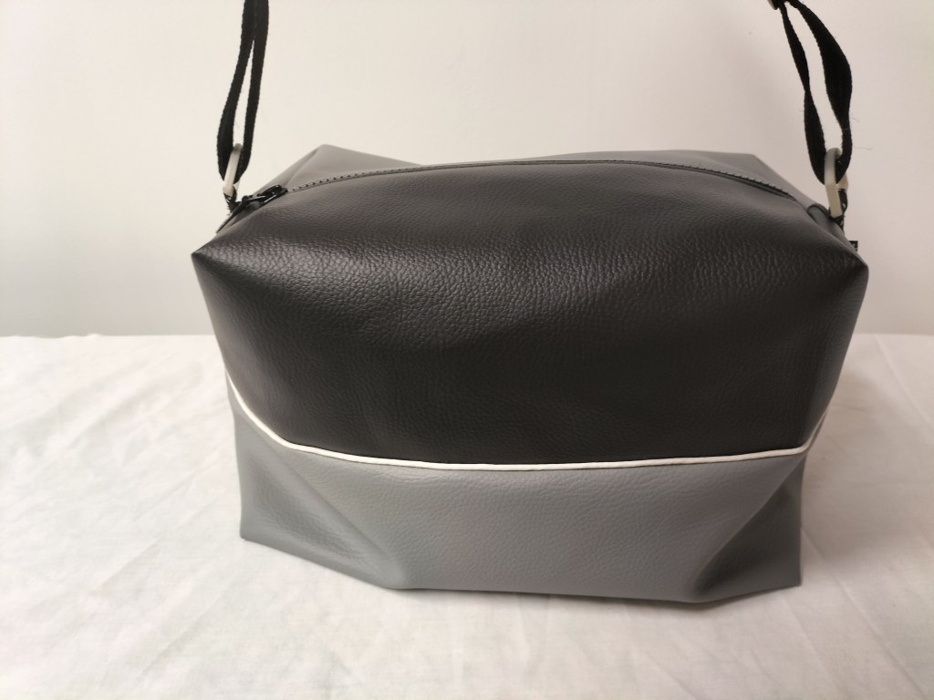 Avec de grandes chutes de simili gris clair et noir, j’ai confectionné ce sac à déjeuner sur la base du patron Georges. J’ai modifié les dimensions et les proportions pour obtenir un sac de forme carrée. L’utilisation du passepoil blanc permet de donner une touche chic. J’ai fait le choix d’inverser les couleurs pour donner un côté un peu plus rigolo à ce sac que mon mari portera sur l’épaule presque chaque jour de la semaine pour son déjeuner au travail.