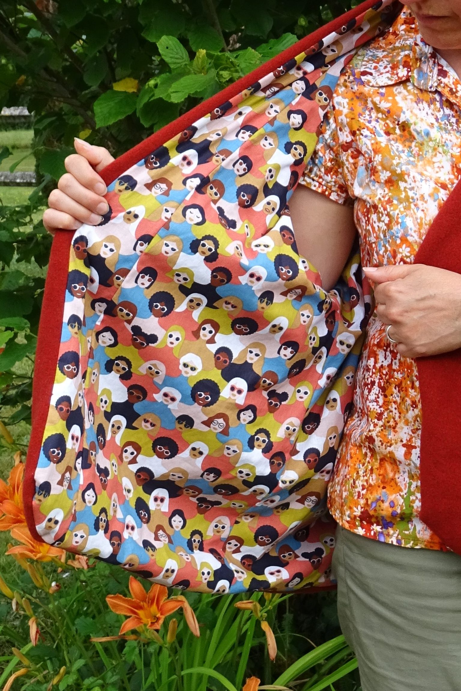 Pekka que j’aurais pu aisément renommée « Où sont les femmes ? » est une veste en lainage couleur rouille avec une doublure en coton que j’adore et qui représente une foule de femmes de toutes les couleurs et origines avec des lunettes de soleil la plupart et quelques une avec des lunettes de vue. J’ai carrément flashé sur ce coton au printemps dernier et je l’ai acheté tout de suite pour terminer cette veste. C’est d’ailleurs cet achat qui a déterminé la fin de cette attente interminable entre l’automne dernier où j’ai commencé à décalquer le patron et couper le tissu extérieur et le printemps où je l’ai fini. Le fait de ne pas avoir trouvé LE tissu pour la doublure a largement contribué à mettre en pause cette veste pendant six mois !