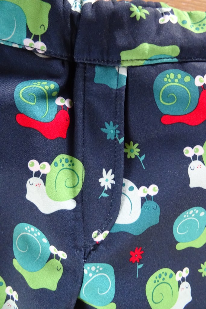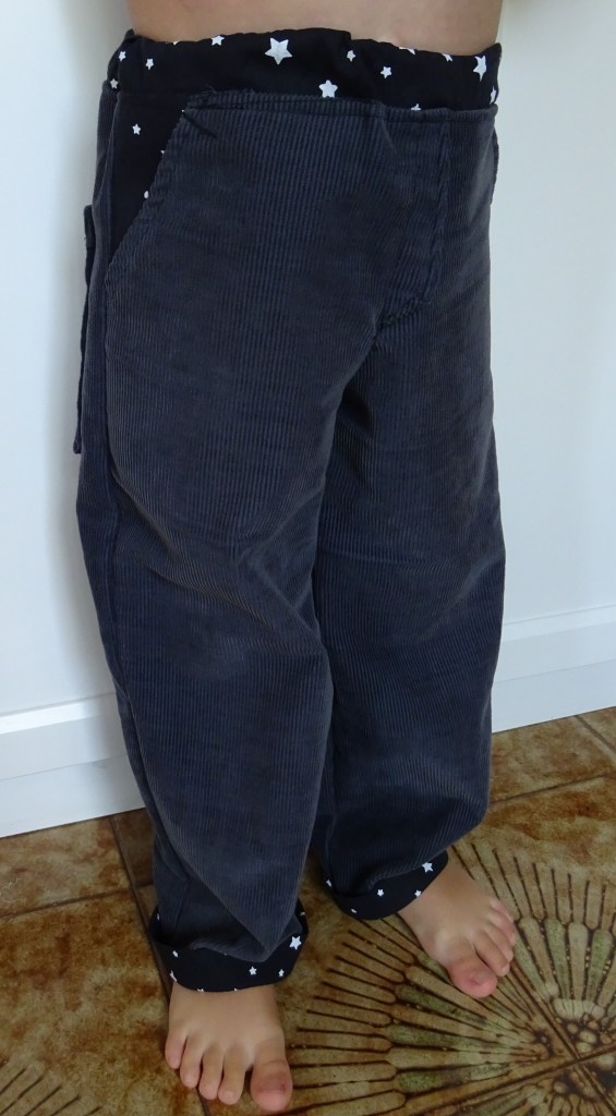 et la ceinture élastiquée permet de bien faire tenir le pantalon. J’ai cousu la ceinture de sorte qu’une fente puisse laisser l’élastique à bonne portée de main au cas où il faille le changer sans avoir à tout découdre…
