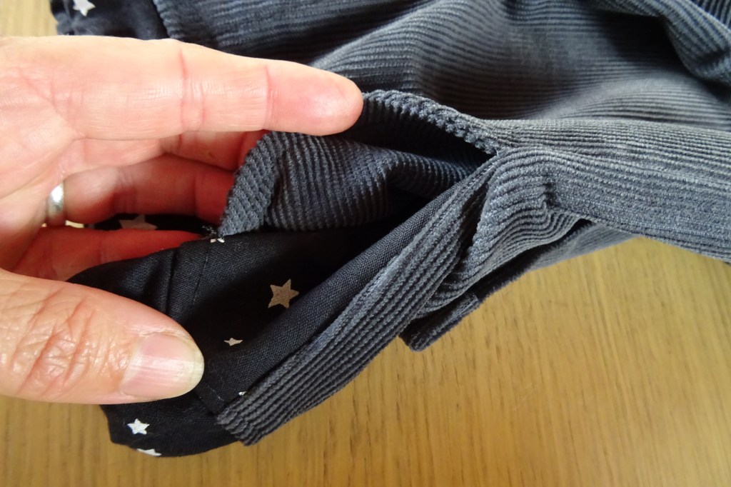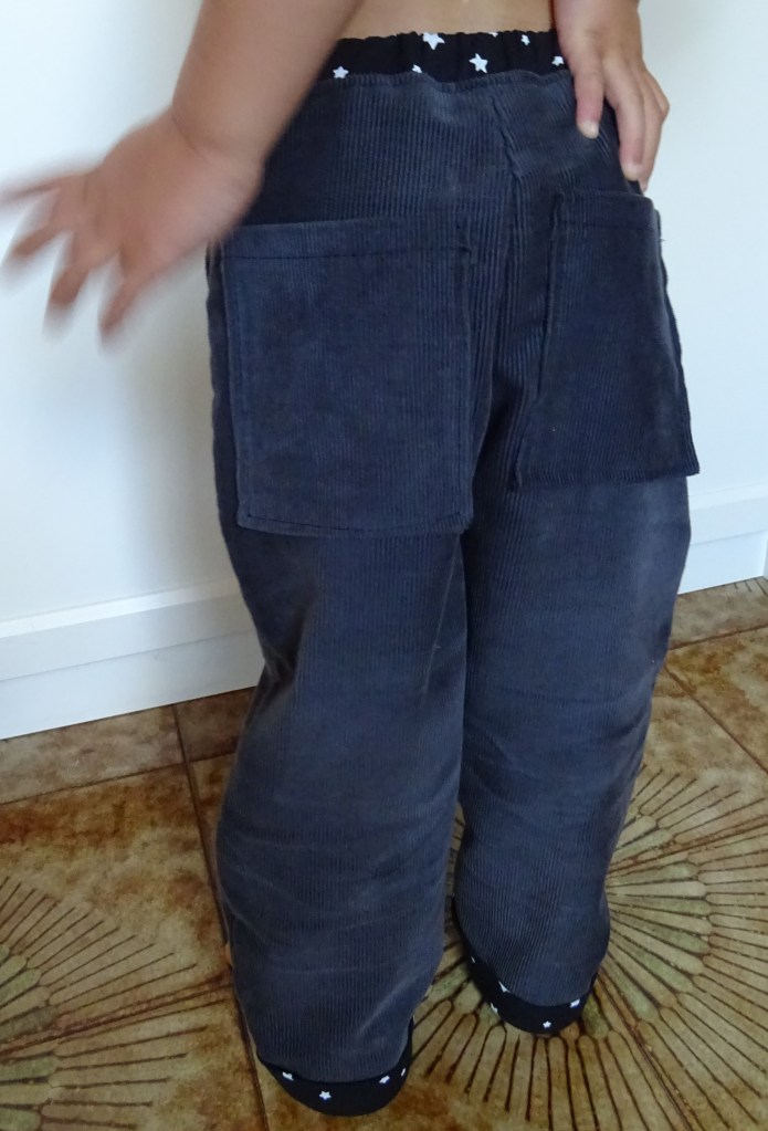 Concernant l’assemblage tout s’est bien passé jusqu’à ce que je me rende compte de mon erreur pour les tissus des poches, j’ai voulu découdre et autant vous dire que cela faisait déjà une heure et demi que j’étais dessus… Et là « juste Ciel ! » je me suis motivée à trouver fissa une solution moins longue à mettre en place… N’ayant pas l’expérience des deux premières cousettes contrairement à ma maman qui a pu rectifié son erreur sur le deuxième pantalon ce que je ferais sur ma deuxième version si j’en ai le courage… Le dessous poche aurait dû être en tissu velours côtelé et je l’ai cousu dans le tissu de la doublure car je pensais que le dessous était l’intérieur de la poche sauf que c’est l’inverse. Le tissu étant assez fin je l’ai renforcé avec du thermocollant épais histoire d’être sure que de 1 le P’tit Cœur ne va pas avoir froid et de 2 qu’il ne va pas déchirer son pantalon à cet endroit en mettant ses mains dans les poches.