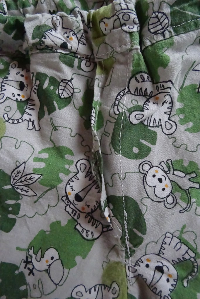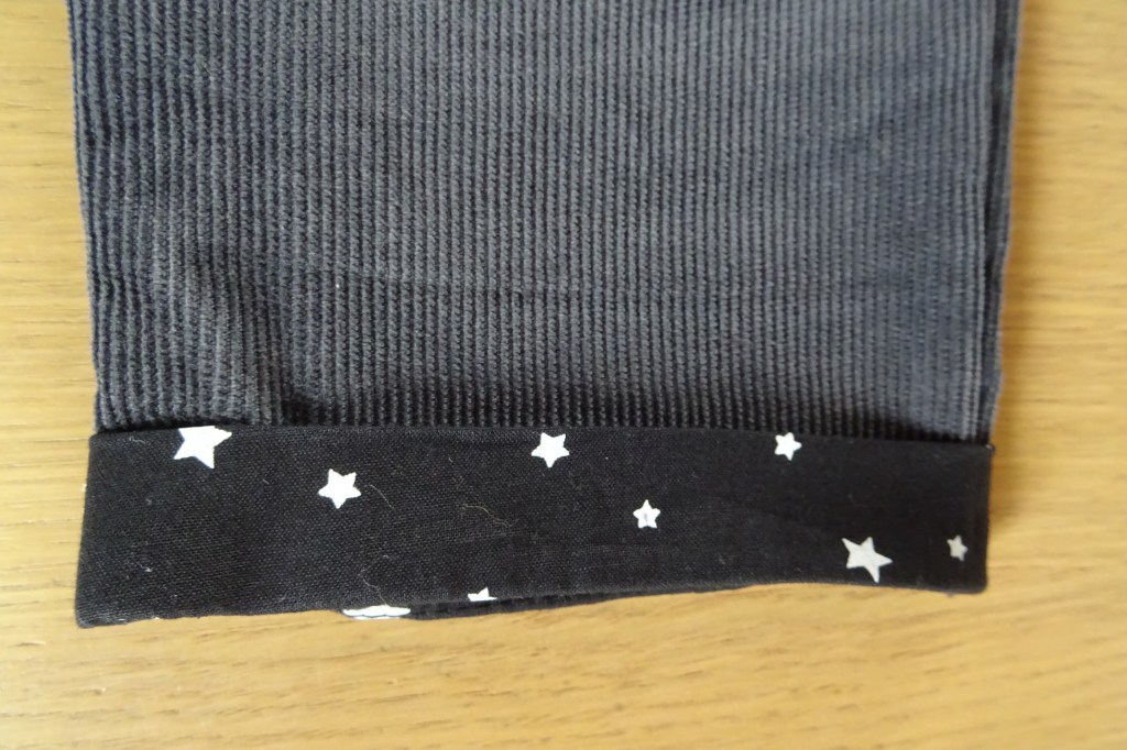 Le bas de pantalon est réalisé avec une bande d’ourlet que j’ai monté pour en faire un revers. Normalement le modèle préconise de mettre un élastique pour resserrer le bas de jambe. Ayant déjà testé cette technique sur d’autres modèles je sais d’expérience que cela fait remonter le bas de jambe et lorsque l’enfant grandit, c’est moins joli.
