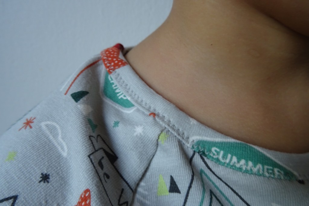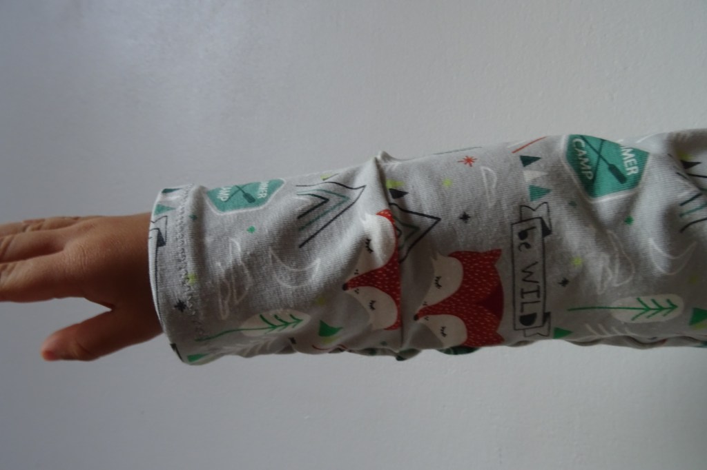 C’est un tissu donc d’été comme son nom l’indique en jersey gris clair avec des motifs de renards roux et tipis. Je le trouve très mignon. Le modèle est le même présenté que celui de la semaine dernière, j’aurais pu les mettre ensemble mais comme je participe au challenge déstockage de tissu de La Petite école de Caroline j’ai ici une autre étoile à cocher pour un tissu déstocké !