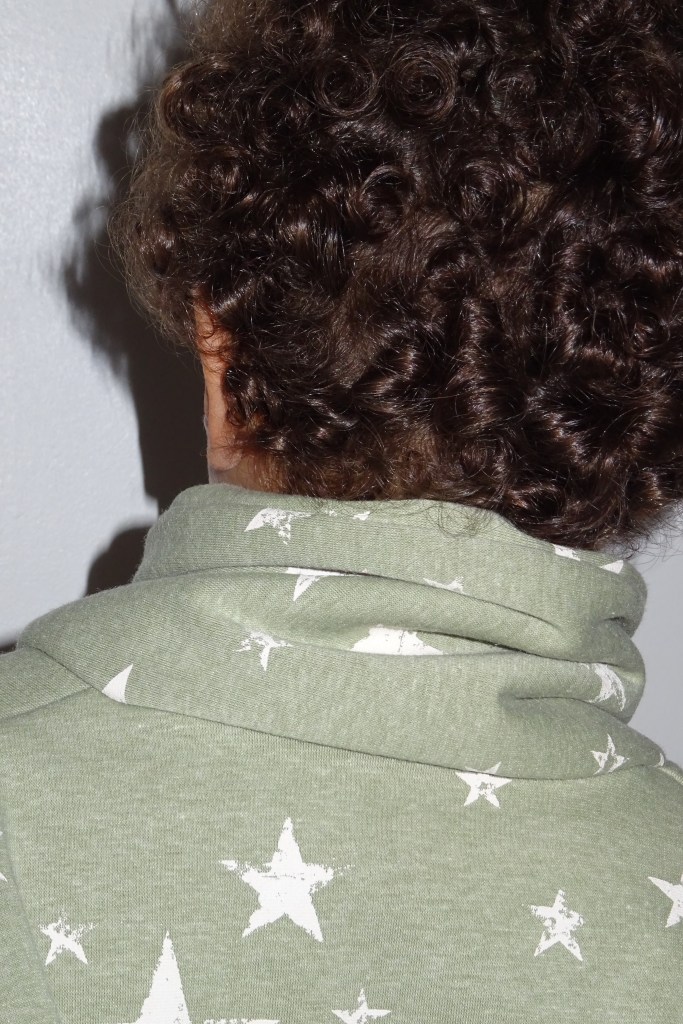 Le bouton provient de mon stock de boutons, kaki avec des effets de texture, il s’harmonise parfaitement avec le tissu. Le cordon est recyclé à partir d’un pantalon de jogging qui appartenait à son papa.